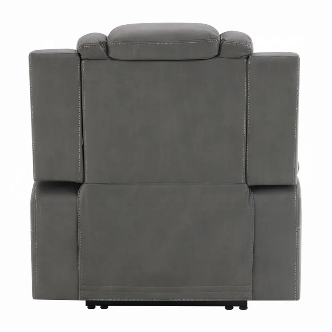 The Leuco recliner is upholstered in premium gray leather aire, offering the appearance of genuine leather with added durability and easy maintenance.