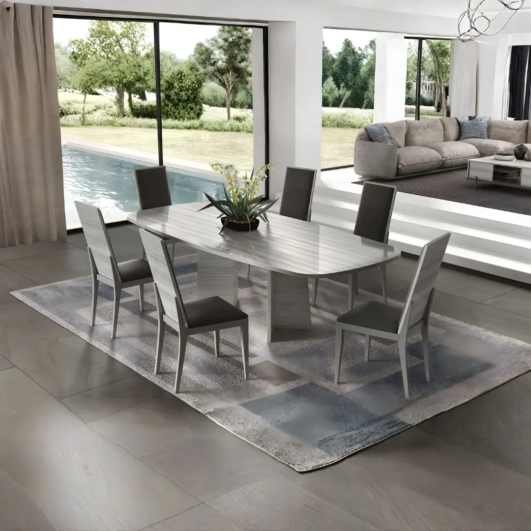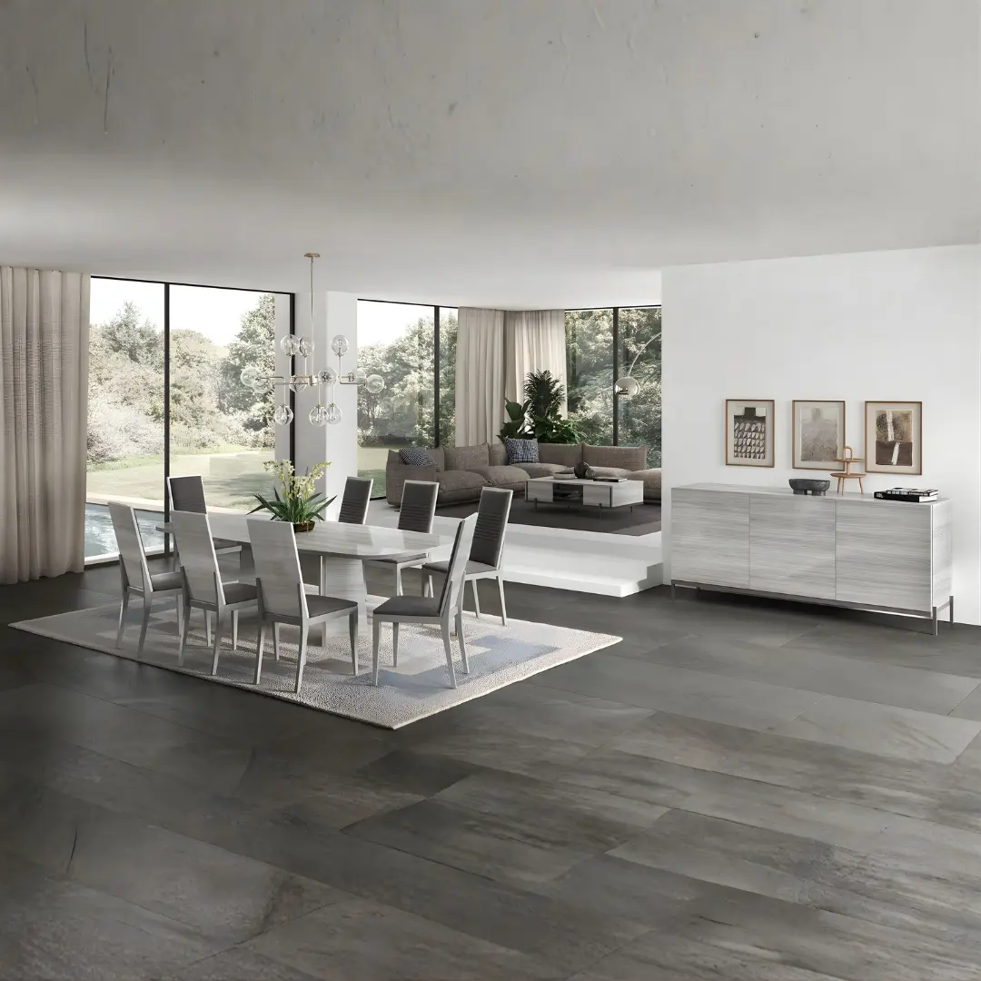 Welcome to the elegant and contemporary “Mia” dining room, a space that exudes sophistication and charm with its striking anthracite and silver gray eucalyptus finish. Step into this luxurious setting, where modern design and natural beauty harmoniously come together to create a dining experience like no other.