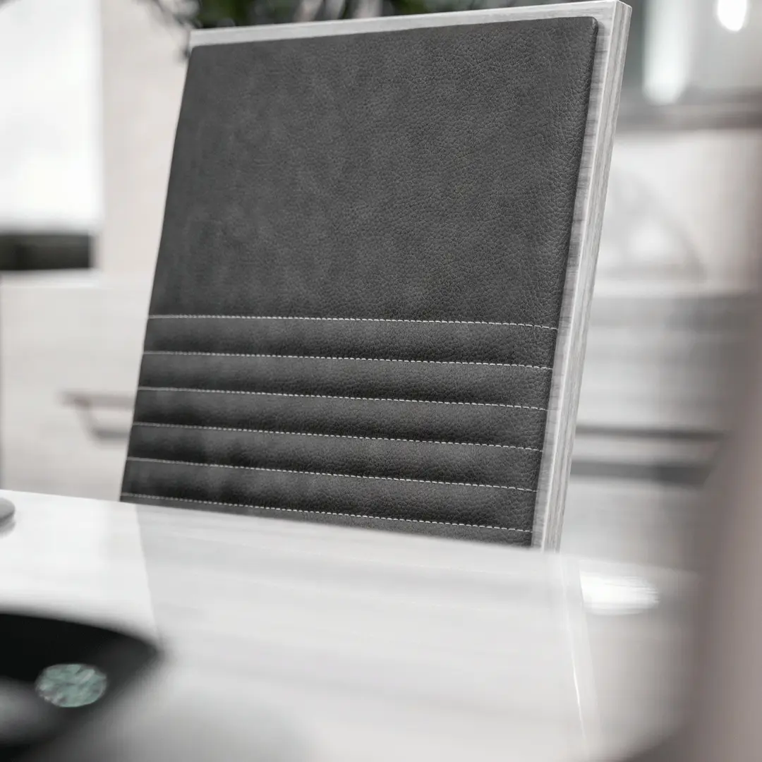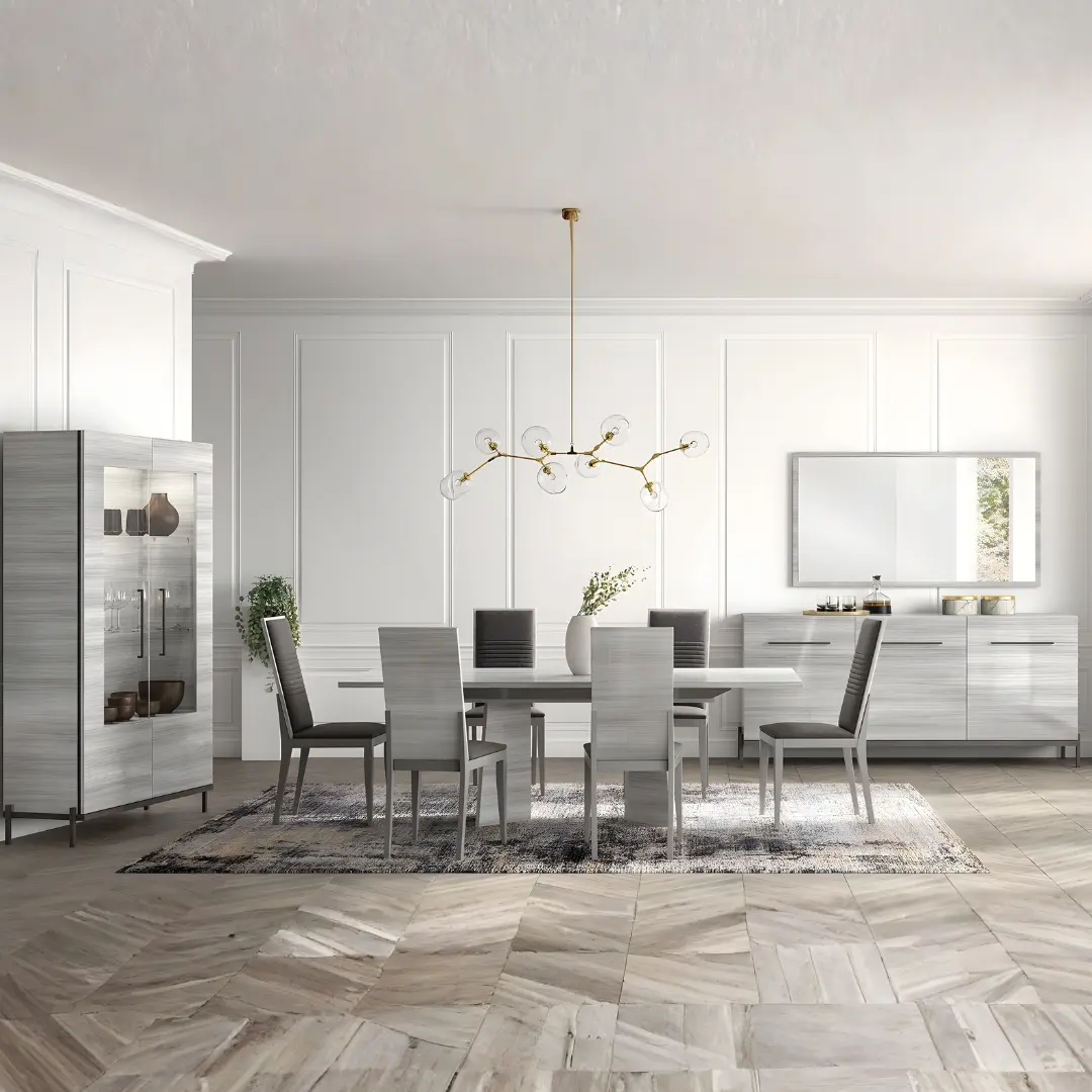 Welcome to the elegant and contemporary “Mia” dining room, a space that exudes sophistication and charm with its striking anthracite and silver-gray eucalyptus finish. Step into this luxurious setting, where modern design and natural beauty harmoniously come together to create a dining experience like no other.