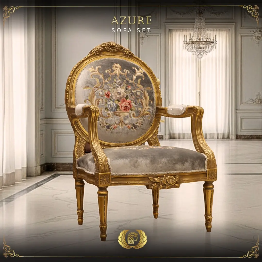 The Azure Gray Gold Chair by Kleopatra Kingdom embodies Rococo elegance in a graceful form. Built from solid beech wood with a glowing gold finish, its sculpted carvings recall the grandeur of European palaces. Upholstered in dolphin gray fabric, the chair offers a versatile elegance that complements both modern and classical interiors. Whether paired with the full set or used as a standalone accent, it adds timeless luxury to any space.