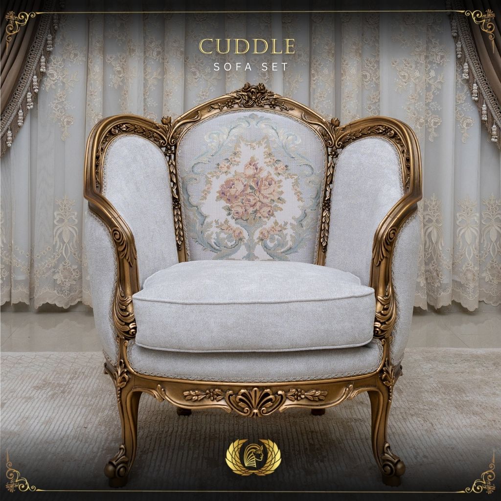 The Cuddle Chair by Kleopatra Kingdom is a refined accent piece designed to complement luxurious interiors. Wrapped in soft ivory fabric and framed with a bronze finish, it offers warmth, sophistication, and balanced proportion within any seating arrangement.