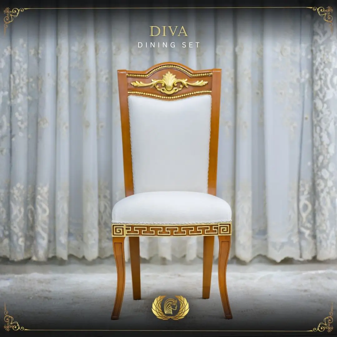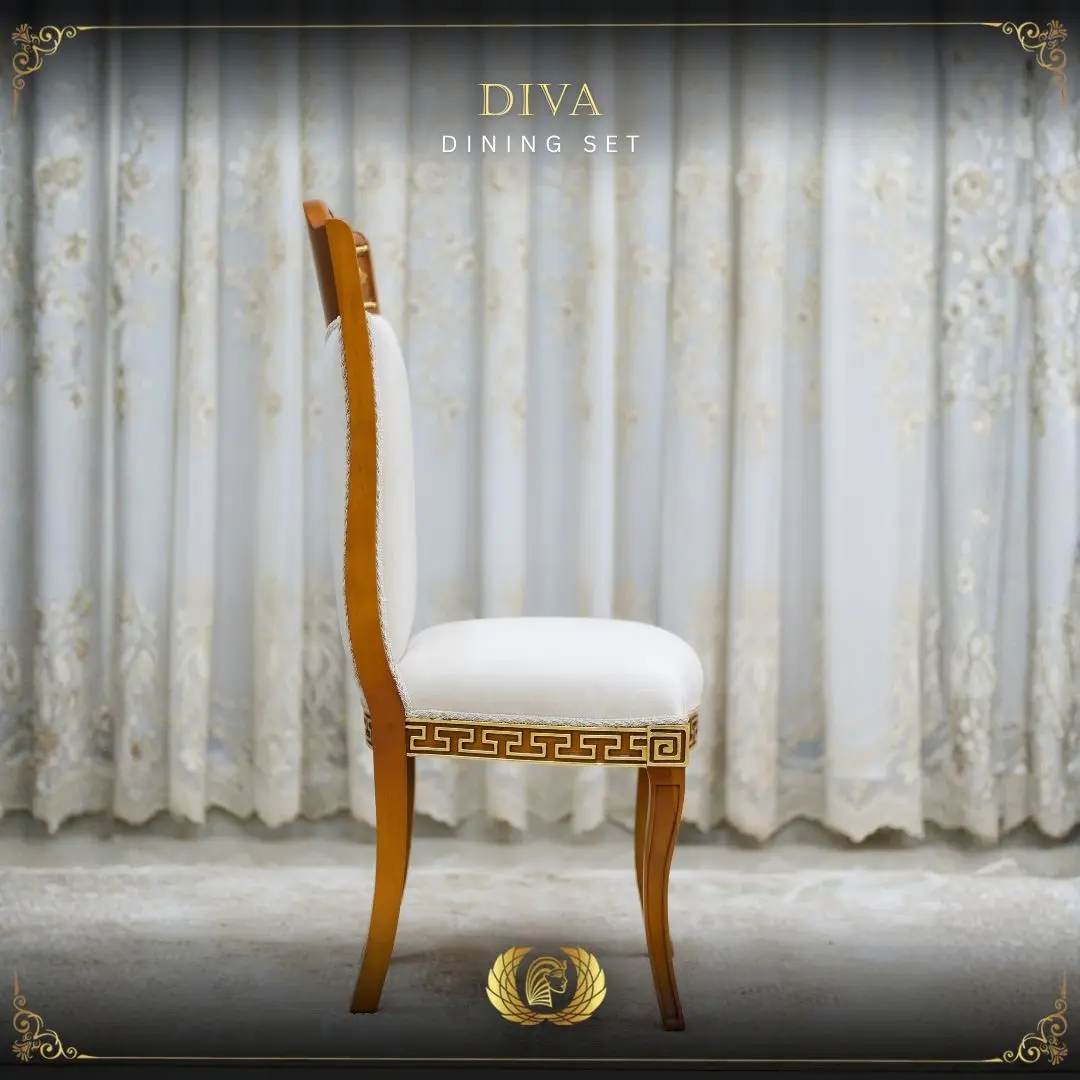 The Diva Side Chair — where heritage craftsmanship and golden accents create timeless dining sophistication.