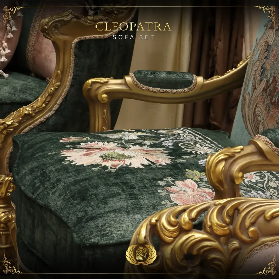 Cleopatra showcases stunning Turkish embroidered leather patterns that have evolved over the centuries and have now attained design icon status. Natural beech wood frame, Italian leather x leprechaun x soft matte velvet upholstery, gold bronze x gold leaf finish base with premium foam padding. The Cleopatra sofa is undoubtedly a class classic and a must-have for contemporary interiors.