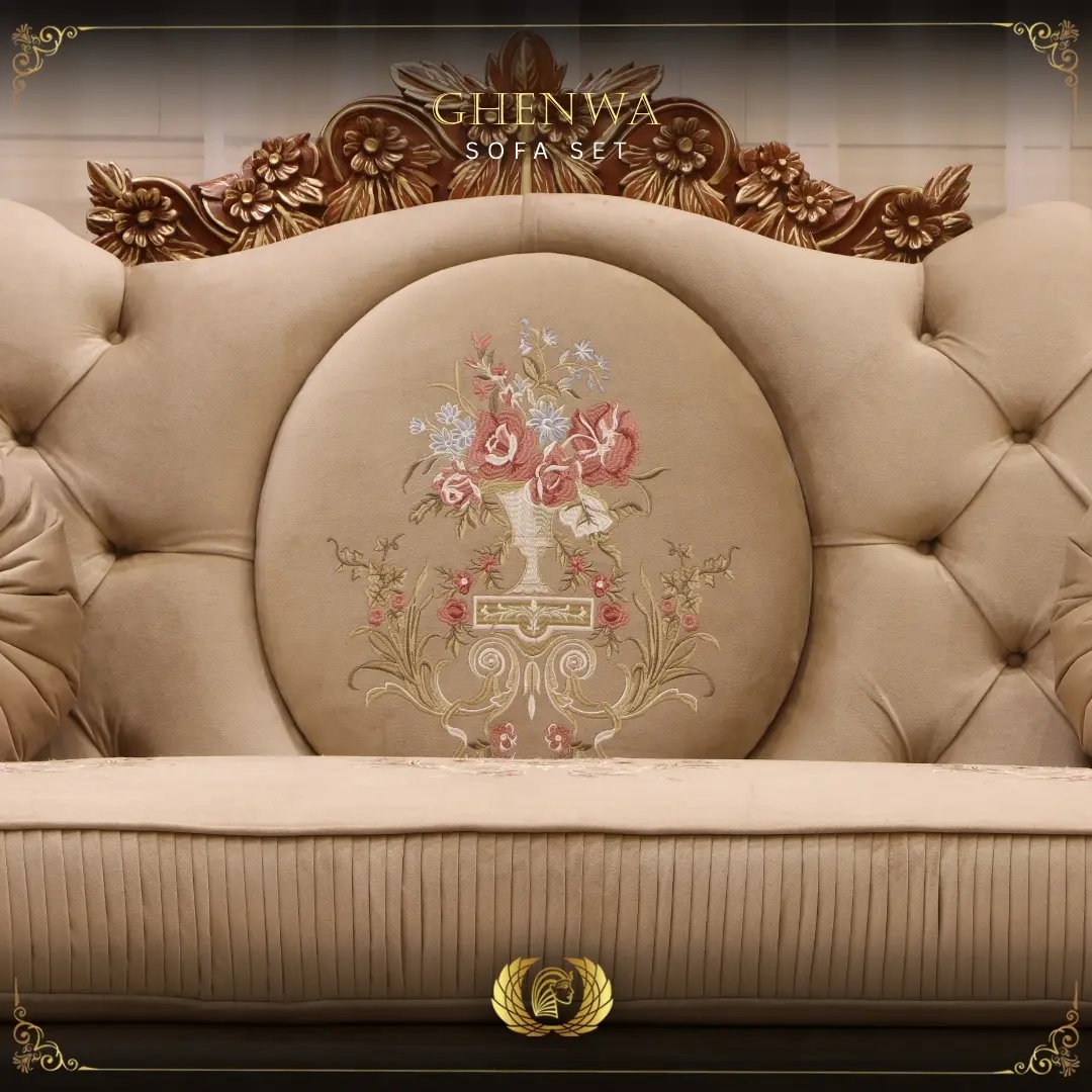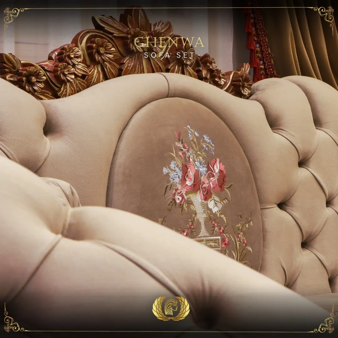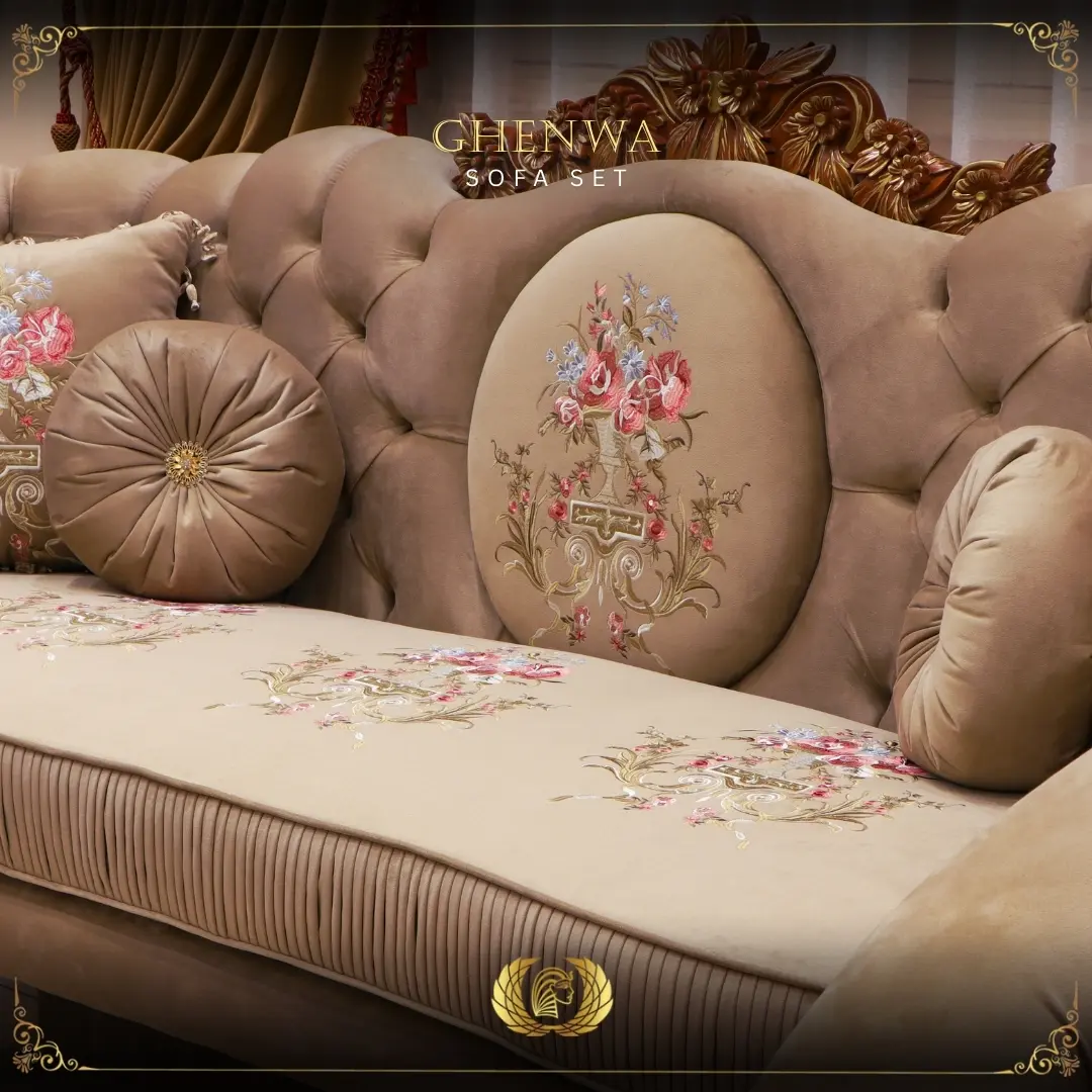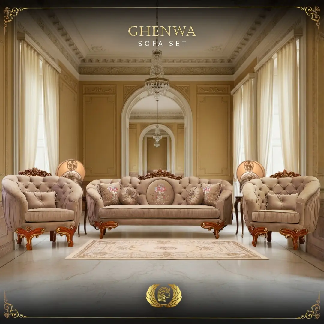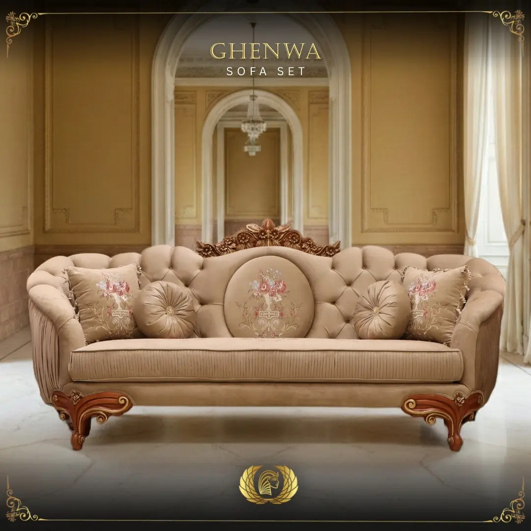 The Ghenwa Brown Sofa by Kleopatra Kingdom captures the richness of Rococo tradition in a grand centerpiece. Its beech wood frame, adorned in a dual gold and brown finish, brings depth and majesty to its sculpted curves. Upholstered in khaki fabric, it combines elegance with comfort, offering plush seating and refined detailing. This sofa anchors your living room with noble charm, blending heritage artistry with lasting comfort.