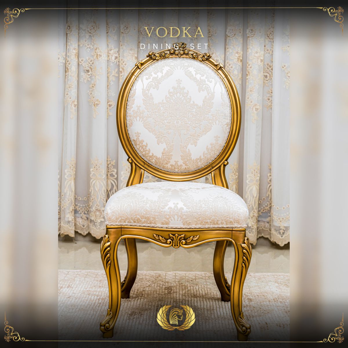 The VODKA Side Chair by Kleopatra Kingdom captures the grace of Rococo artistry in a refined and elegant form. Framed in solid beechwood with gold leaf accents, it showcases exquisite hand-carved detailing and smooth, flowing lines. Wrapped in soft off-white upholstery, it offers both timeless sophistication and inviting comfort.