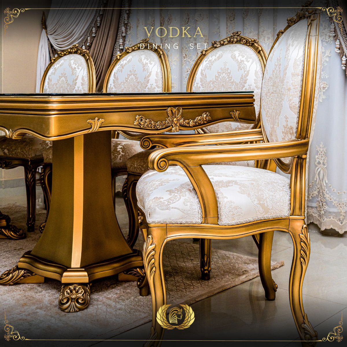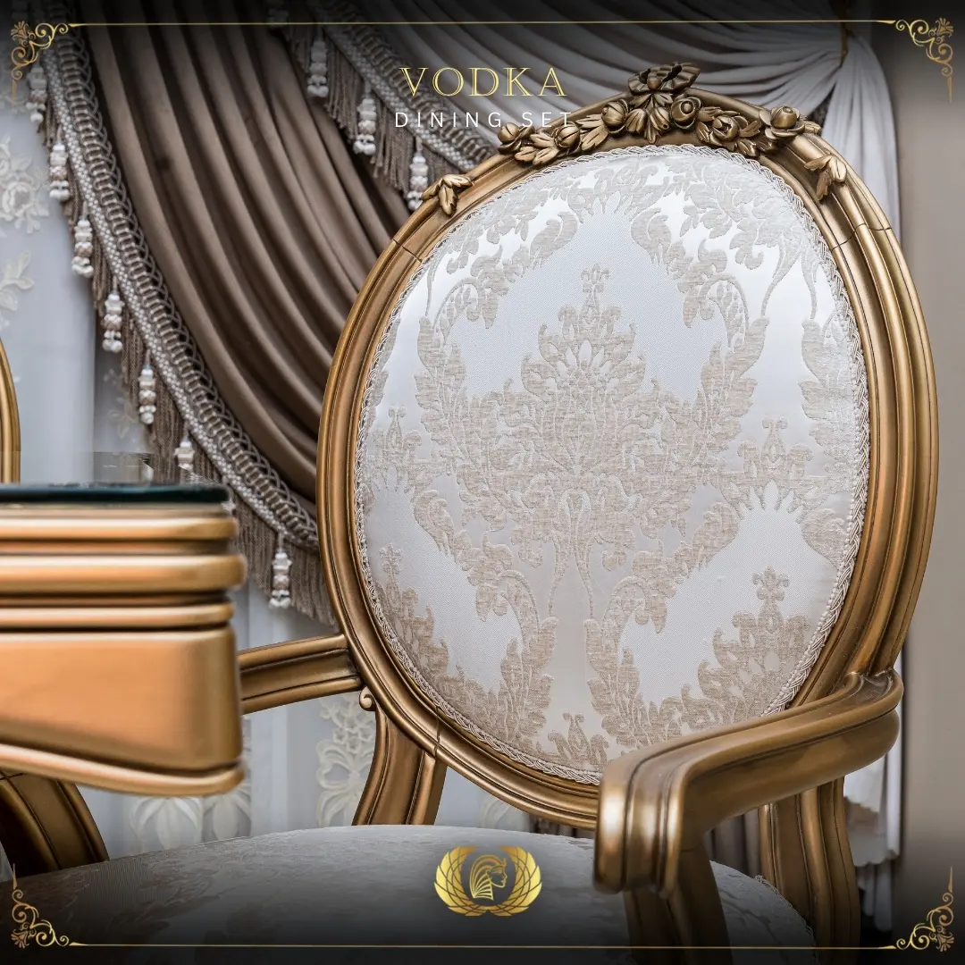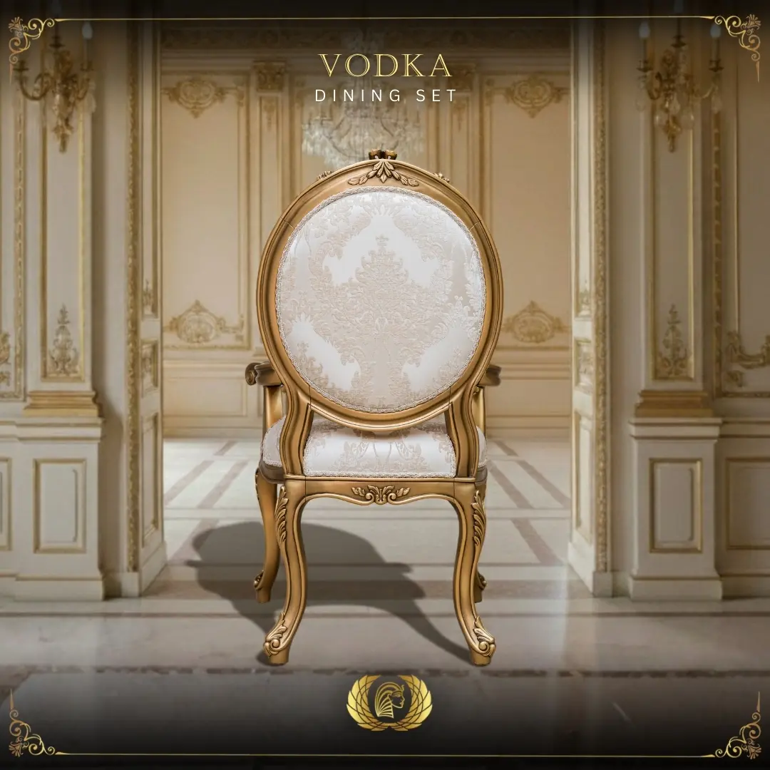 The VODKA Armchair by Kleopatra Kingdom embodies Rococo refinement at its finest. With its gold-accented frame, hand-carved details, and plush off-white upholstery, it offers the perfect balance between regal beauty and inviting comfort.