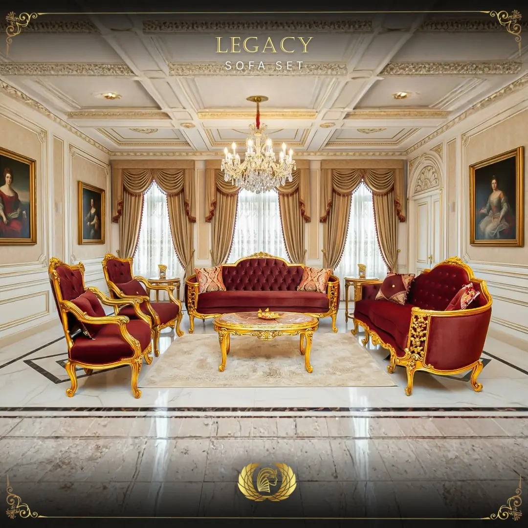 Upholstered in rich burgundy red fabric, each piece radiates warmth, depth, and regal sophistication. From the grand sofa to the elegant loveseat and intricately detailed chairs, every element of the Legacy Collection reflects meticulous craftsmanship and timeless refinement.