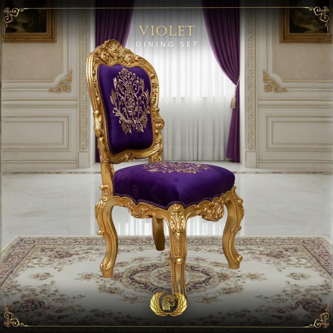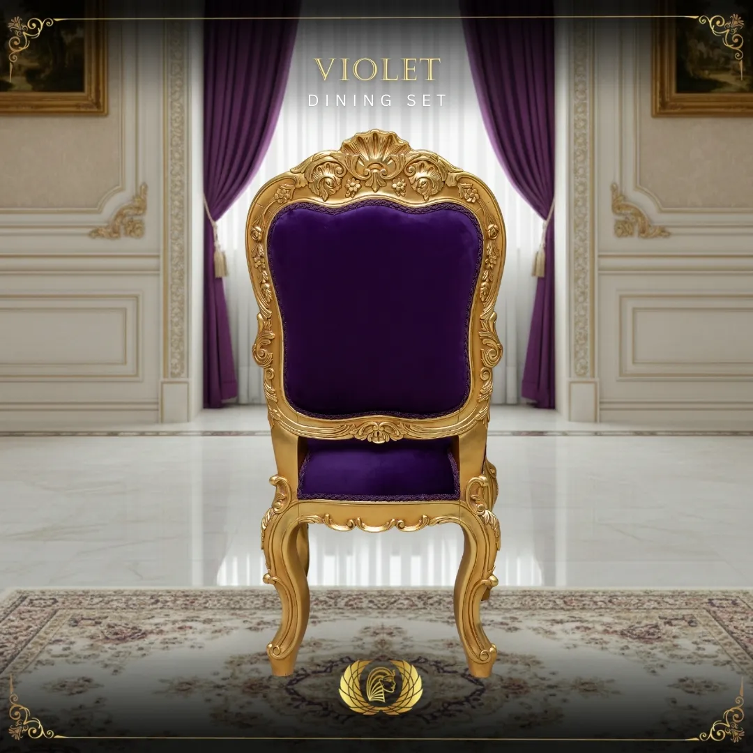 The VIOLET Side Chair completes the dining arrangement with bold sophistication. Its rich purple upholstery and sculpted gold frame create a harmonious yet striking visual statement.