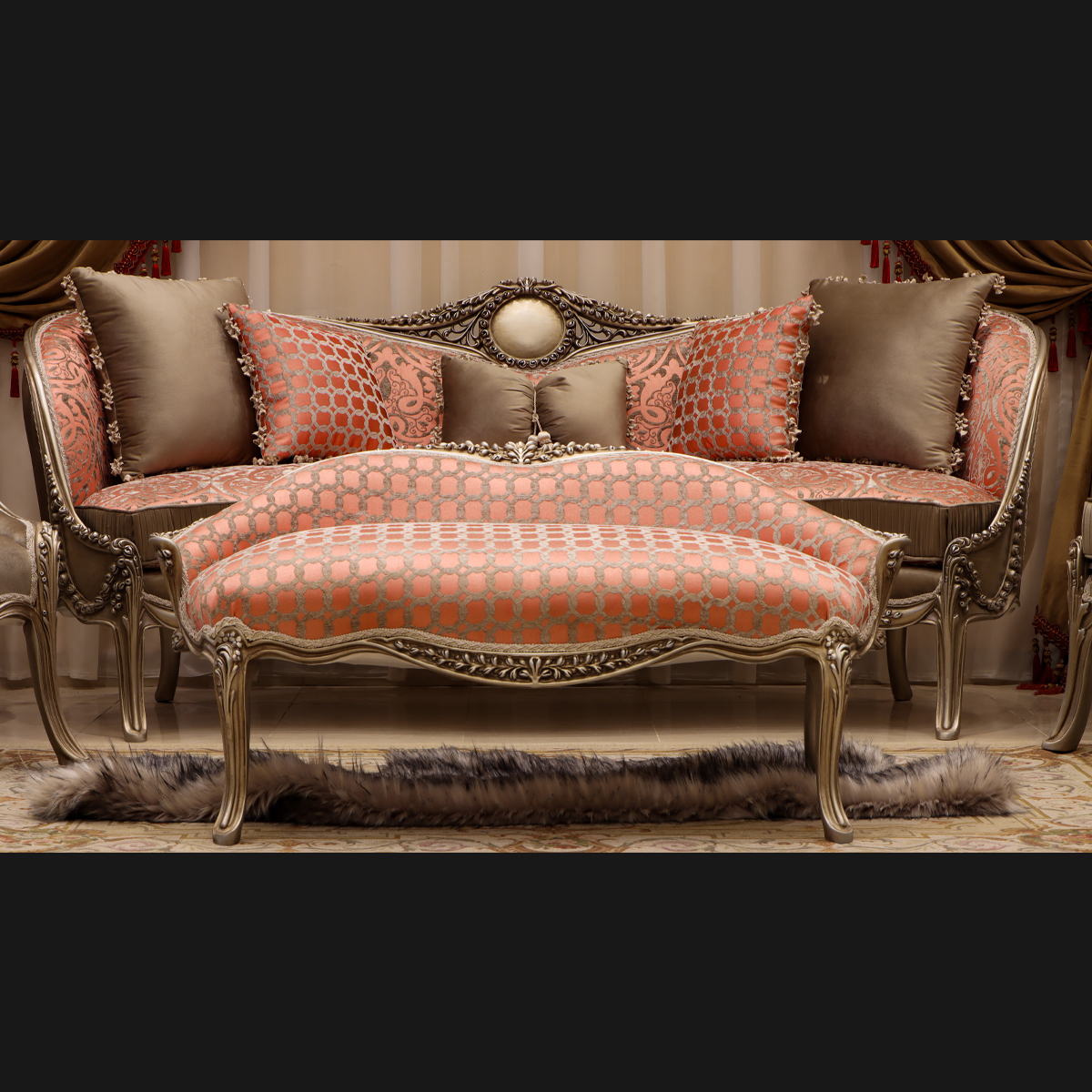 The Maple Chaise by Kleopatra Kingdom embodies relaxation through Neoclassical beauty. Its gently contoured frame, carved from beech wood and finished in champagne, pairs perfectly with pumpkin and taupe upholstery. A timeless piece that invites both repose and admiration, ideal for sophisticated lounges or private retreats.