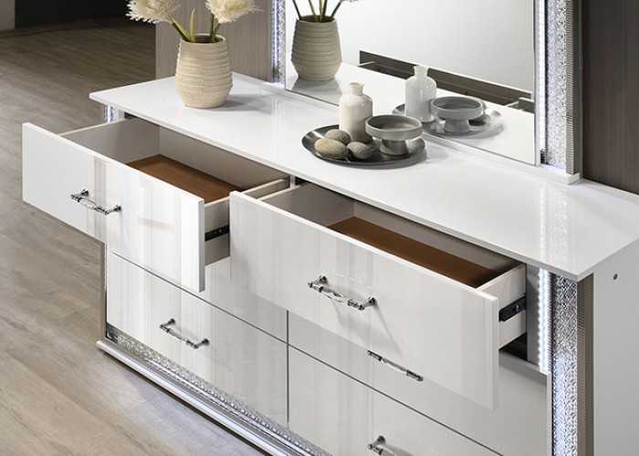 The embedded LED lighting enhances the reflective mirror panels and crystal-effect trim, adding depth and ambient illumination to your bedroom. This thoughtful design detail elevates the dresser’s presence without overpowering the room.