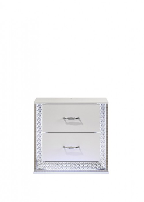 The embedded LED lighting adds a subtle glow that highlights the mirror accents and crystal-effect trim, creating depth and sophistication without overwhelming the space. This lighting detail makes the white nightstand ideal for contemporary bedrooms that value both style and atmosphere.