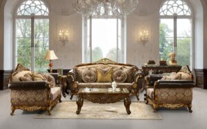 This luxury sofa set perfectly complements ornate rugs, marble-top coffee tables, and classic decorative themes. Its regal posture and quality upholstery naturally elevate both vintage and transitional interiors.