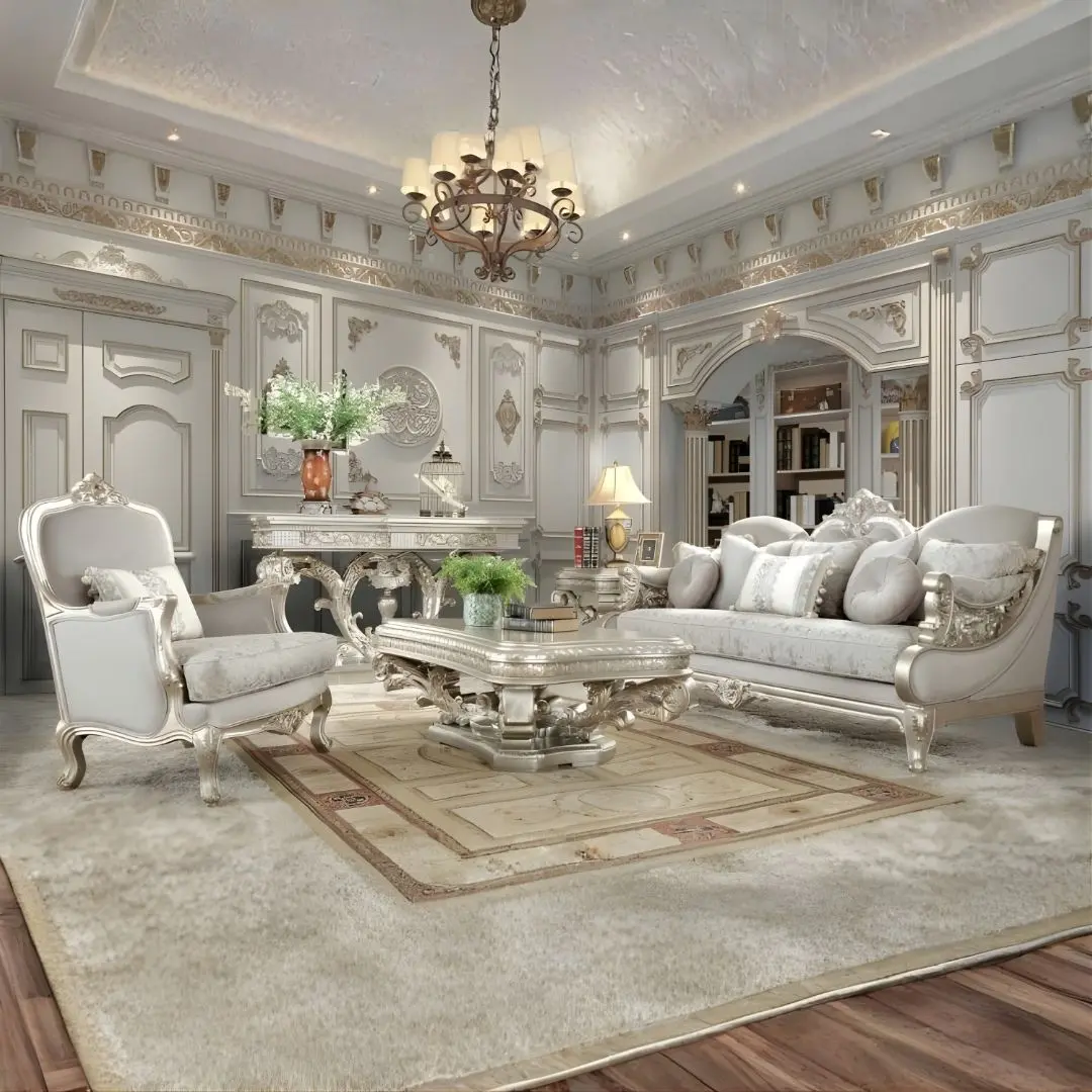 Crafted with premium-grade materials and European-inspired aesthetics, this 3PC set includes a stately sofa, a loveseat, and a matching chair. Each piece showcases hand-applied metallic silver leaf finishing over a solid wood frame, complemented by soft, luxurious upholstery anchored in a neutral platinum tone. The result is a conversation-worthy living room ensemble that radiates opulence and style.
