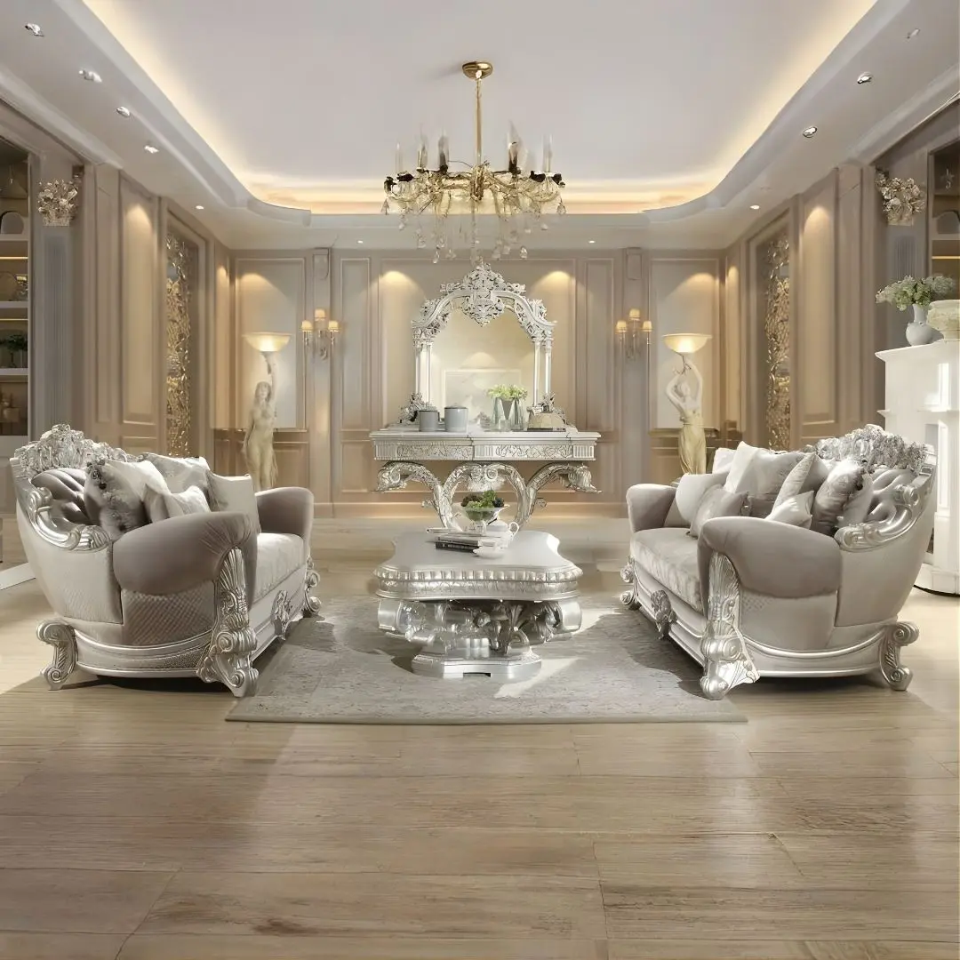 Elevate your living space with the Metallic Silver Finish 3PC Sofa Set Traditional Style Homey Design HD-372—where old-world elegance meets modern luxury. Handcrafted to perfection, this 3-piece set blends richly detailed carvings, premium upholstery, and a radiant silver finish to bring opulence and refinement to any formal living area.