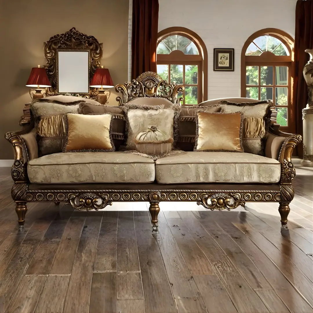 This exquisite sofa is a celebration of classic European artistry, made from hand-carved solid wood and finished in a radiant metallic antique gold tone. Every curve, motif, and flourish speaks to the expert detailing and premium quality construction that define Homey Design’s reputation.
