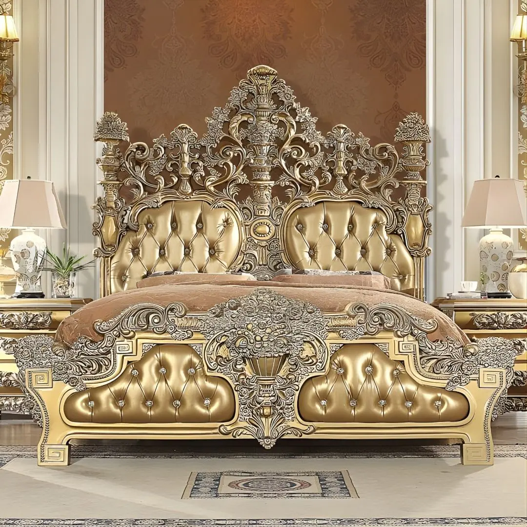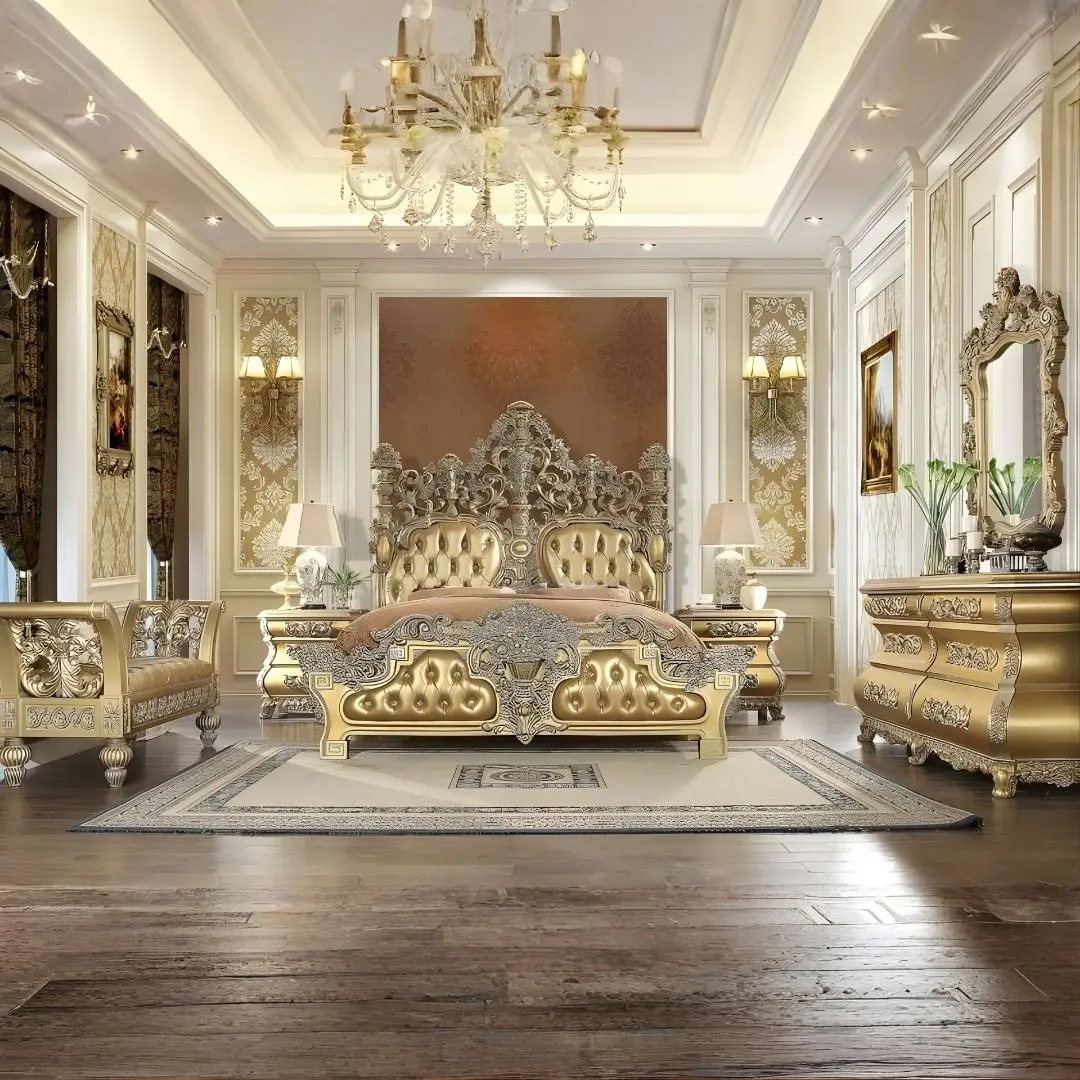 Perfectly balancing visual grandeur with functional design, the set features a radiant metallic bright gold finish paired with carved wood flourishes and rich textures. Designed to suit high-end traditional interiors, each element reflects excellent craftsmanship with a warm, welcoming presence.
