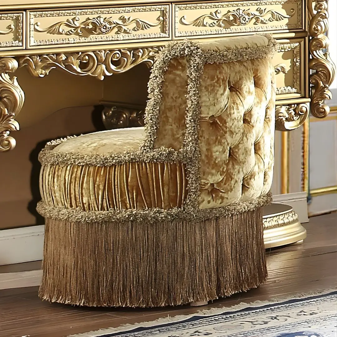 The radiant metallic gold finish delivers a show-stopping presence, highlighting the stool’s beautifully tufted back and graceful silhouette. Whether used at a vanity or as an accent seating piece, the HD-8086 brings vintage-inspired charm into modern luxury spaces.
