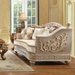Exuding opulence from every angle, the HD-814 loveseat showcases metallic bright gold accents that frame its silhouette with masterful precision. From the trim and decorative finials to its sculpted feet, every gold-accented detail brings warmth and grandeur to your living room, lounge, or formal sitting area.