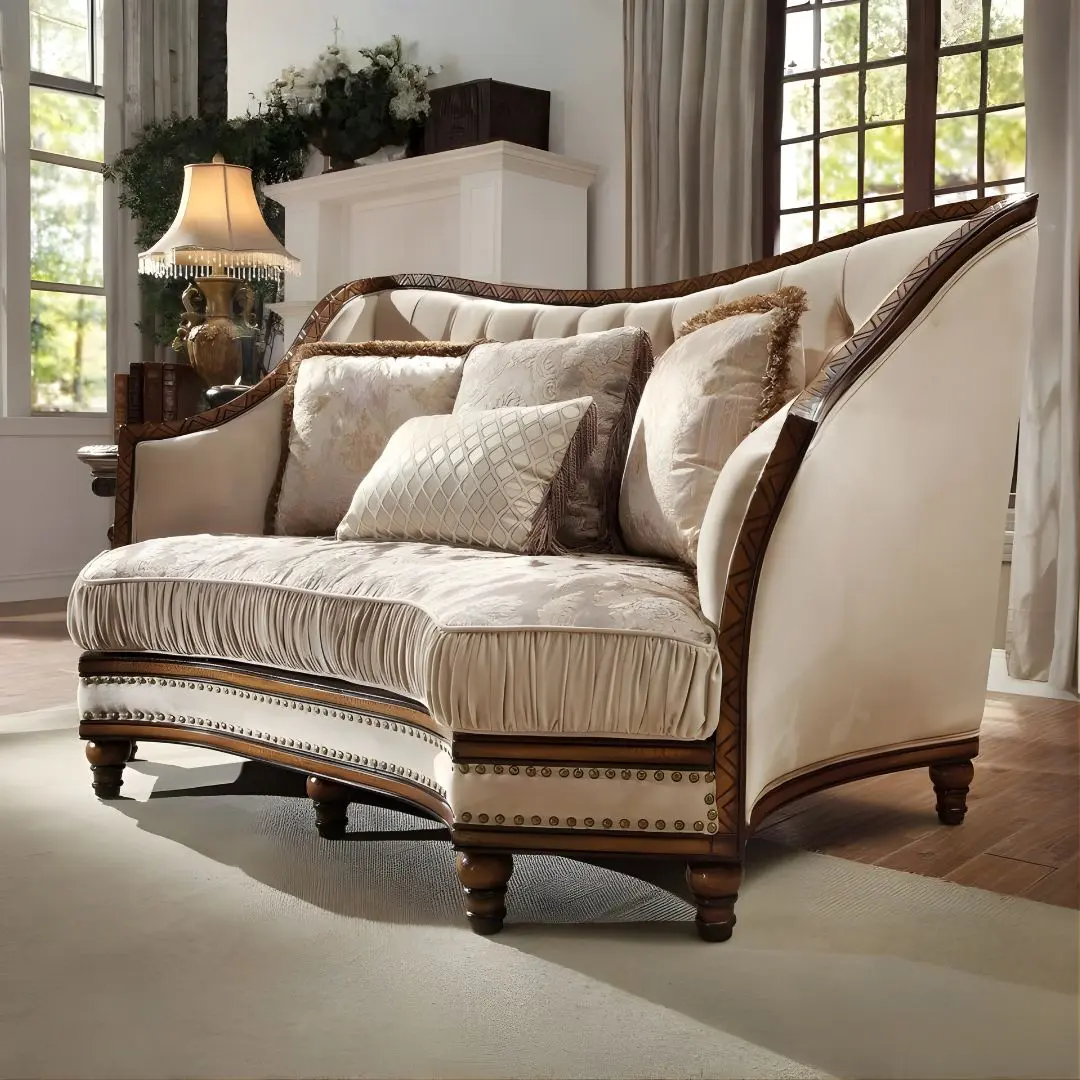 - Design Details: Expertly carved wooden trims and gracefully curved arms inspired by European tradition