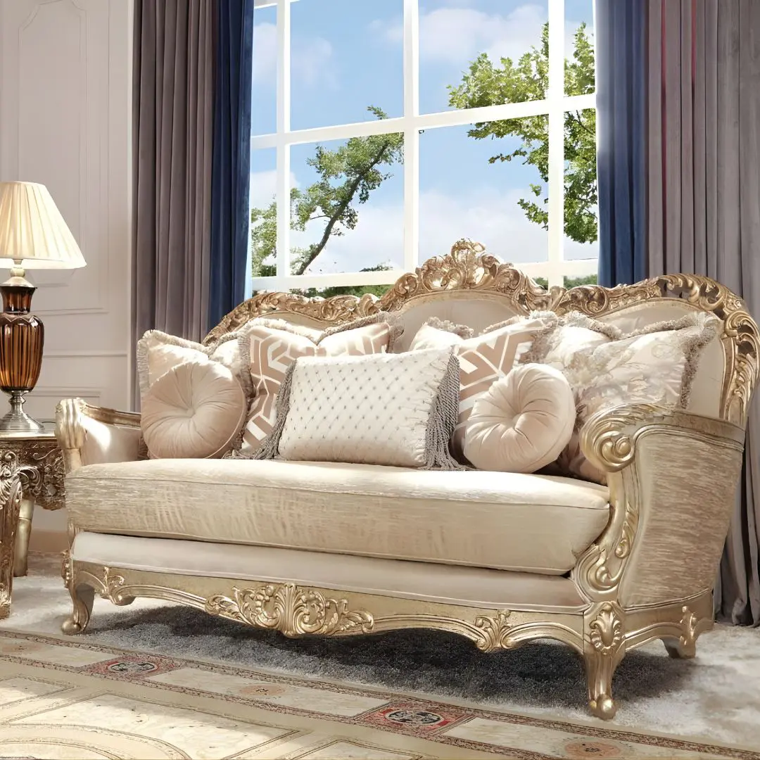 Every element of the HD-8925 Loveseat speaks of refinement. From its hand-carved details to the regal tones of gold and champagne, the design showcases a unique harmony of opulence and comfort, ideal for luxury real estate, hospitality lounges, and interior design projects demanding a statement piece.