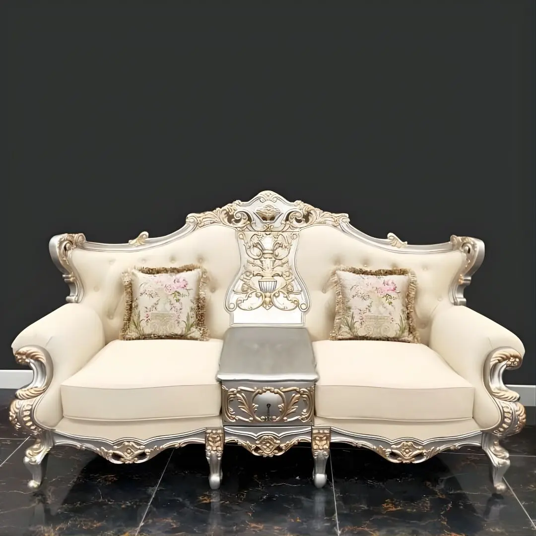 The HD-91633 Sofa Set is a masterclass in furniture artistry. Crafted with solid wood framing and adorned in a rich metallic silver finish, each piece is hand-carved and delicately accented with gold trim for an authentic French Renaissance look. This salon set includes:
