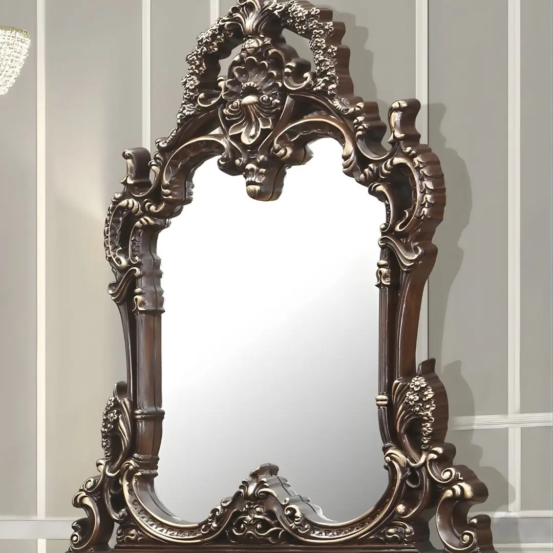 Crafted with a deep, rich Cherry Walnut finish, the mirror’s ornate wood and composite frame captures the grandeur of traditional European design. Intricate hand-carved details and a premium glass surface make it more than a reflective accessory—this is a décor centerpiece that transforms the room it resides in.