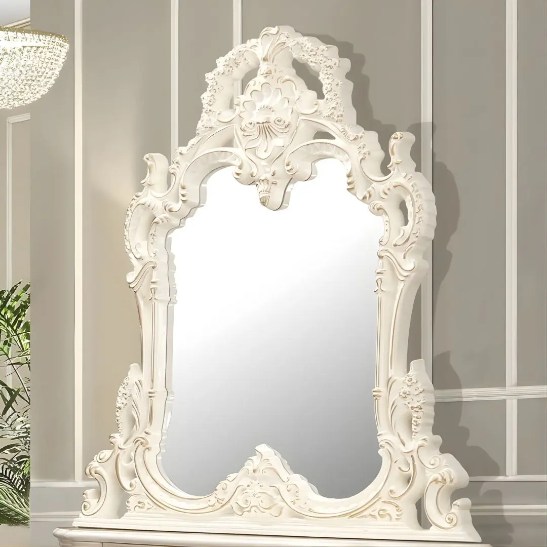 The HD-998I mirror embodies traditional artistry with an aesthetic that seamlessly complements transitional décors. Its hand-carved frame, composed of high-quality wood, glass, and durable composite materials, is finished in a soft ivory tone and enriched with delicate metallic gold highlights — a deliberate color palette that speaks to elegance without overpowering your room’s design narrative.