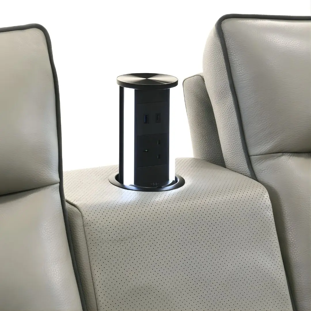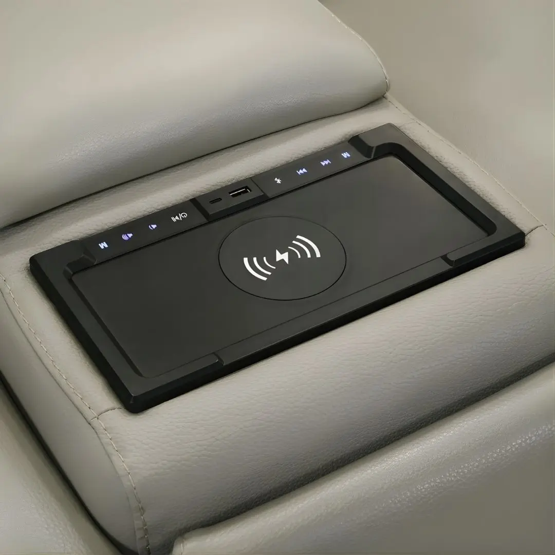 Power switch with USB port embedded in each armrest—simple and accessible.