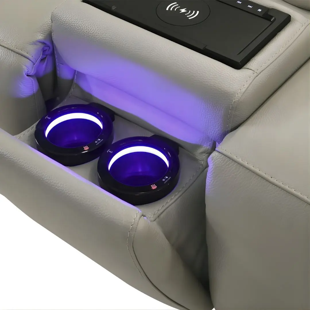 Hidden cup holders feature customizable LED lighting, heating, and optional cooling, keeping your beverage at the perfect temperature close at hand.
