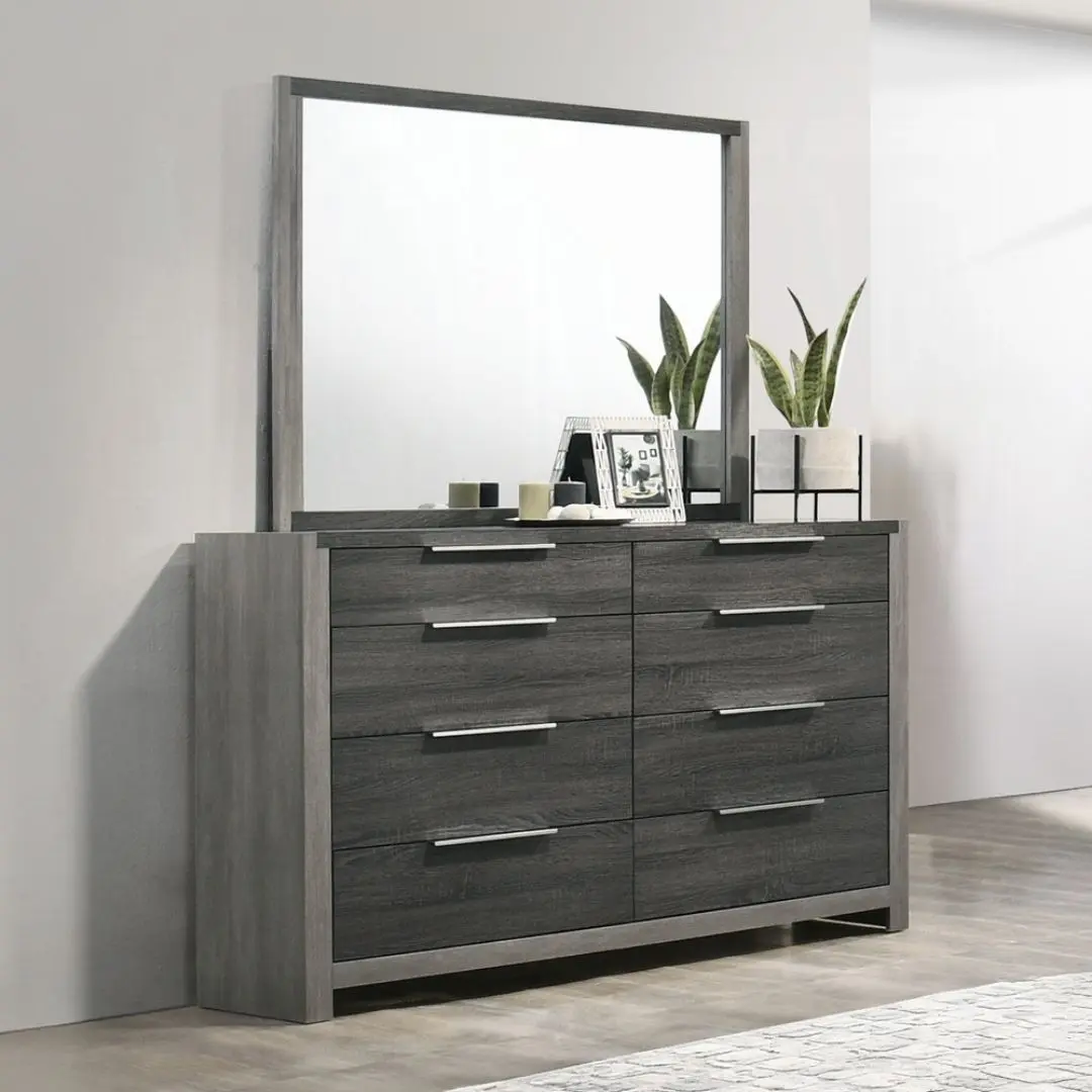 Finished in two-tone gray, making it versatile for modern and transitional bedroom designs.