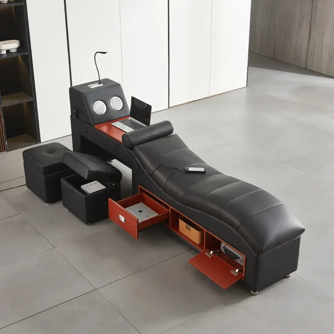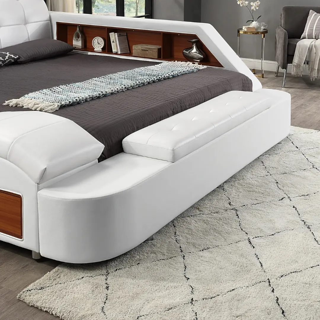 The ergonomic massage chaise lounge promotes well-being, helping you unwind after long days. Pair by the speaker-enhanced headboard, your bedroom becomes a sanctuary for music, podcasts, and pure bliss—all controlled with effortless connectivity.
