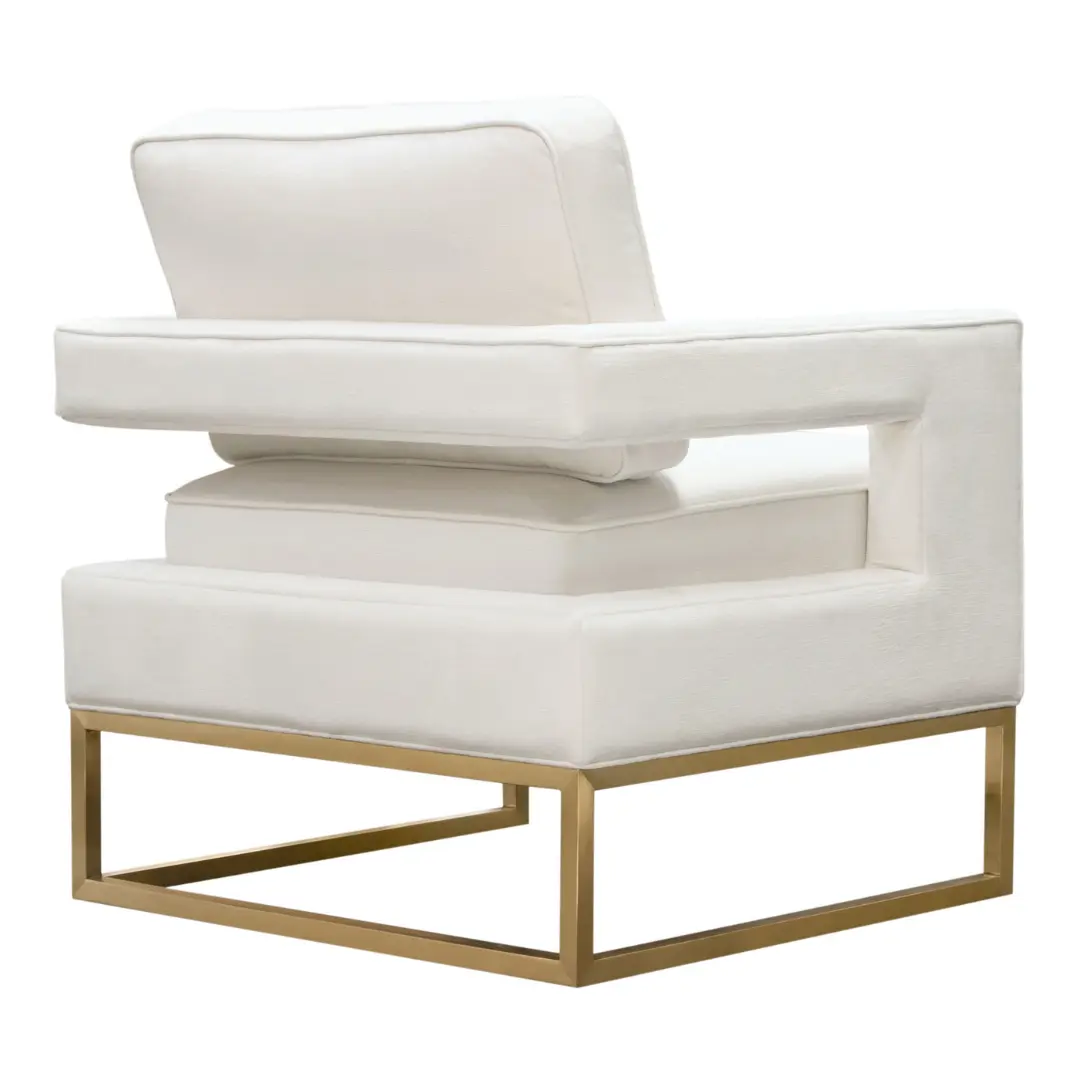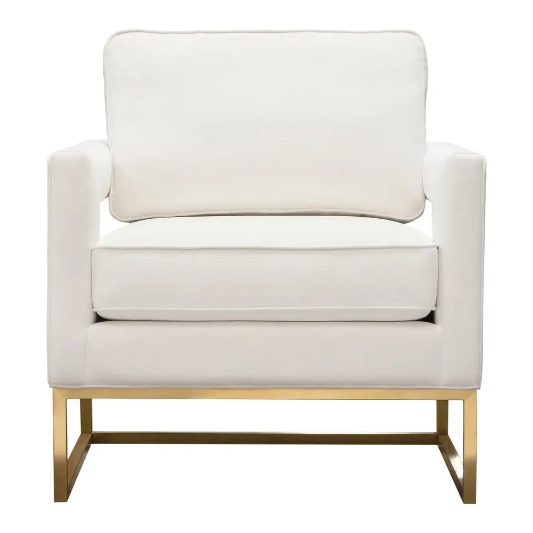 Solid brushed gold metal legs and frame create a striking visual contrast with the white upholstery