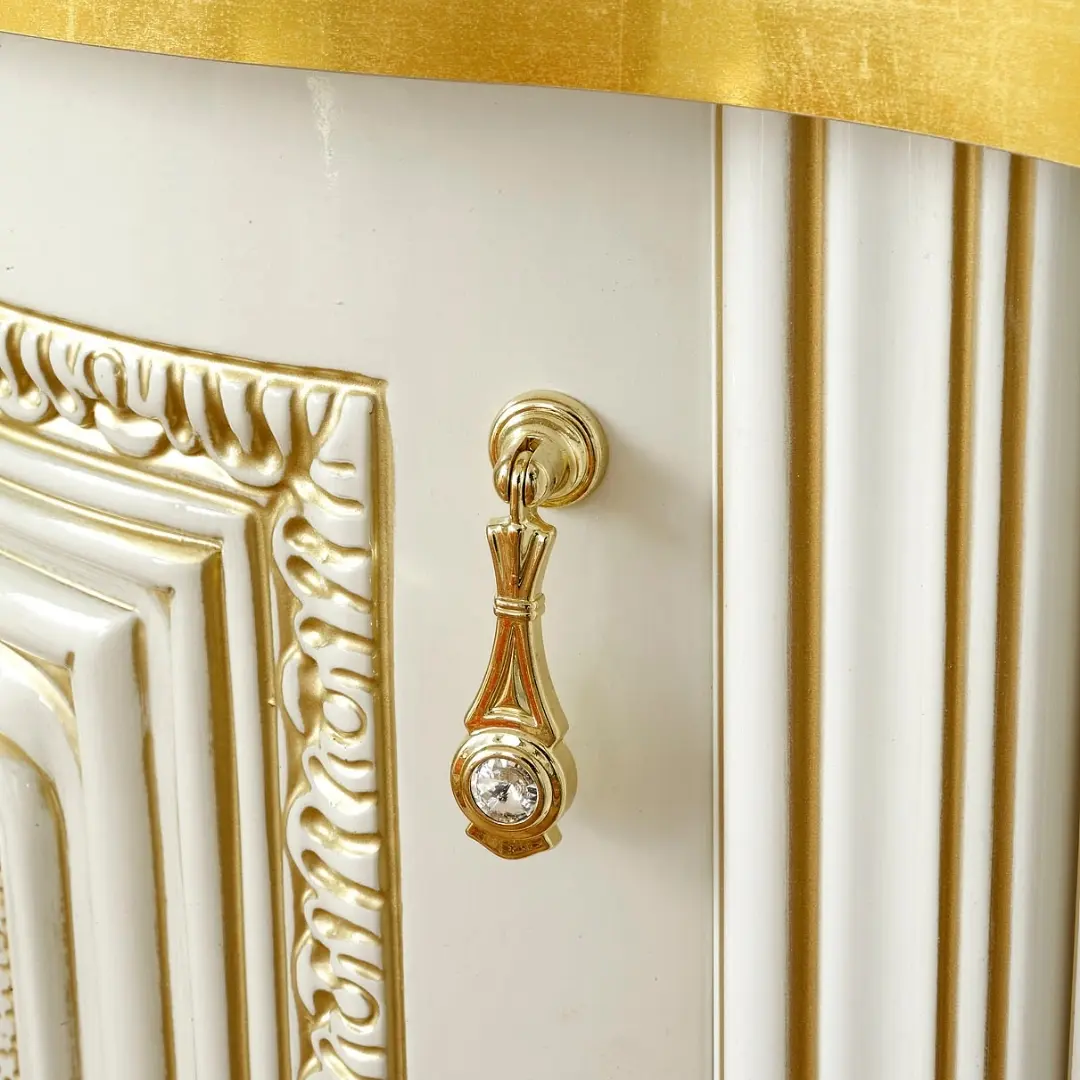 This luxurious Italian dining set showcases meticulous craftsmanship using wood-based panels paired with elegant melamine overlays. Each component is finished with a radiant six-layer UV high gloss polyester lacquer, ensuring a brilliant ivory sheen that resists yellowing over time. Intricately carved accents and smooth, high-shine surfaces bring depth and texture to the collection—blending classic charm with functional comfort.