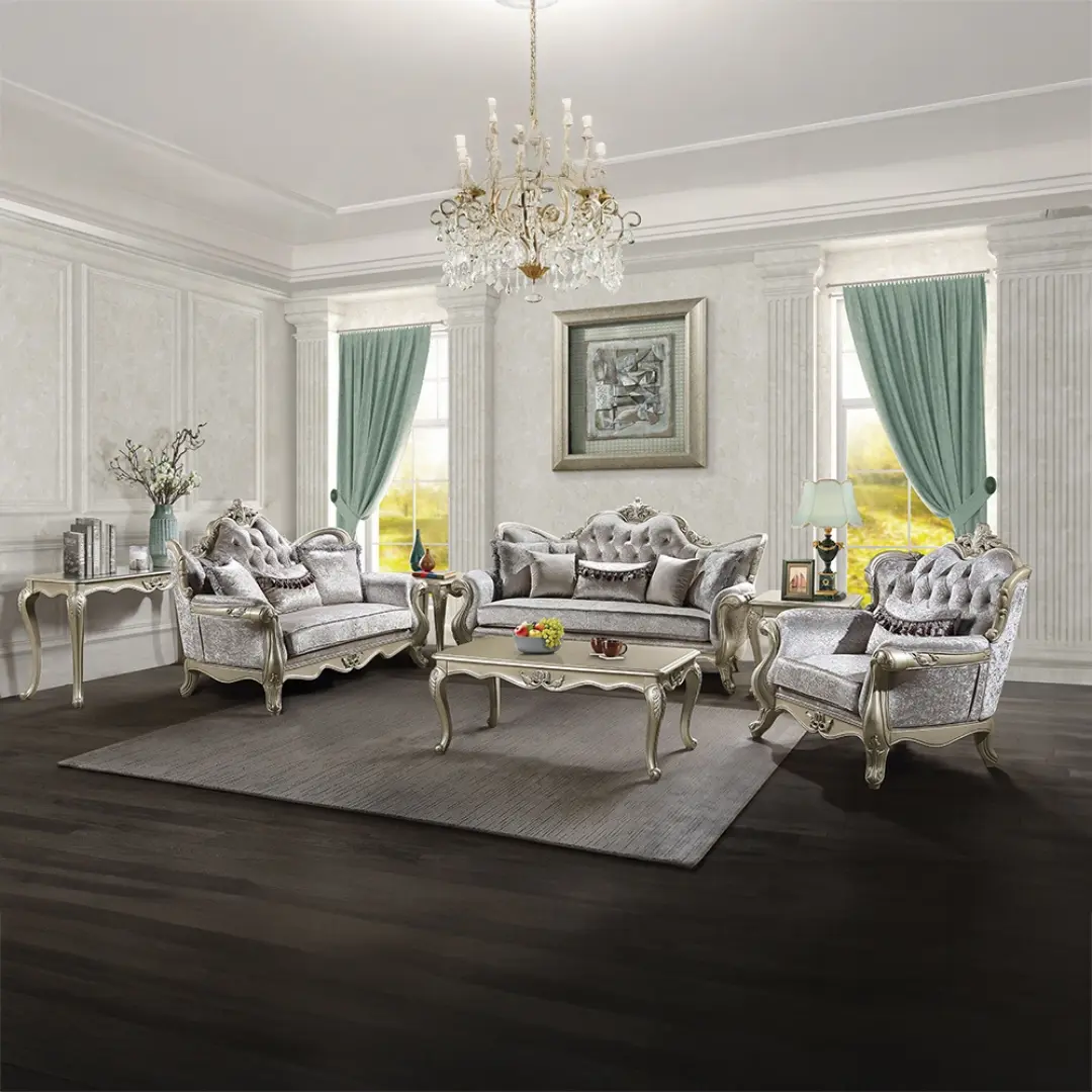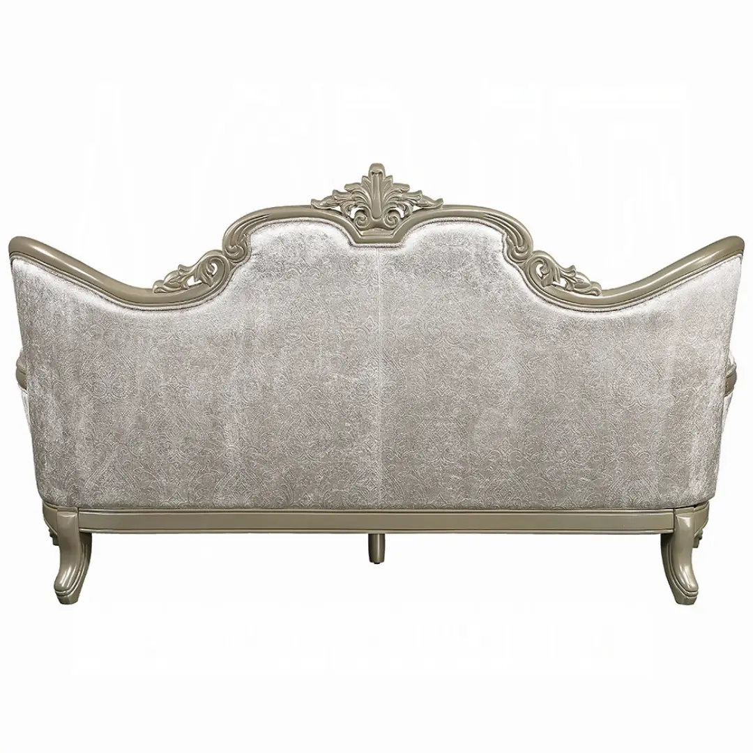 From its button-tufted backrest to the intricate floral trim on the apron and legs, every detail of this beige sofa exudes sophistication. The neutral beige fabric complements various décor styles, effortlessly blending into traditional or contemporary interiors. Built on a sturdy wooden inner frame with a KD back, legs, and armrests, this sofa is designed for durability and longevity.