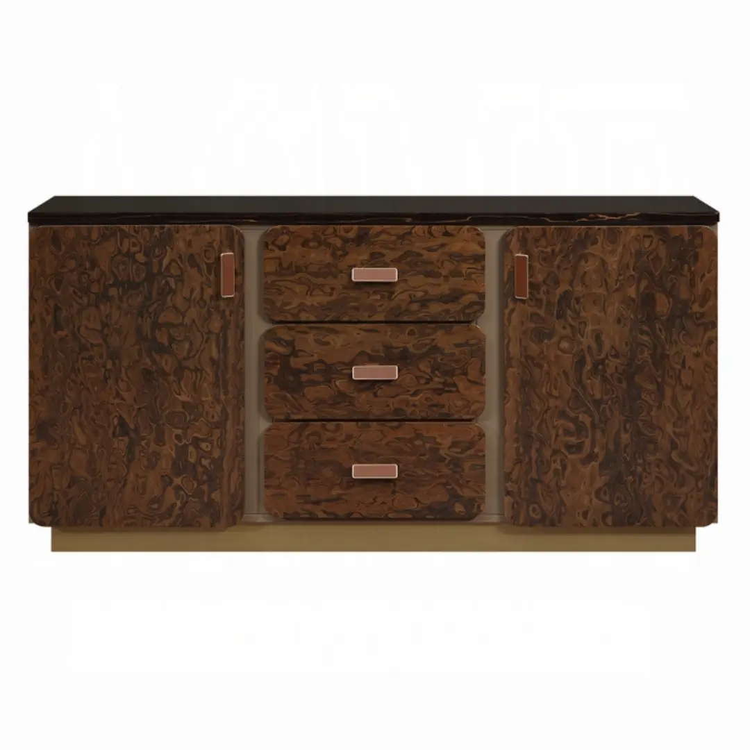 - Golden sandalwood and walnut burl veneers for a luxurious texture
