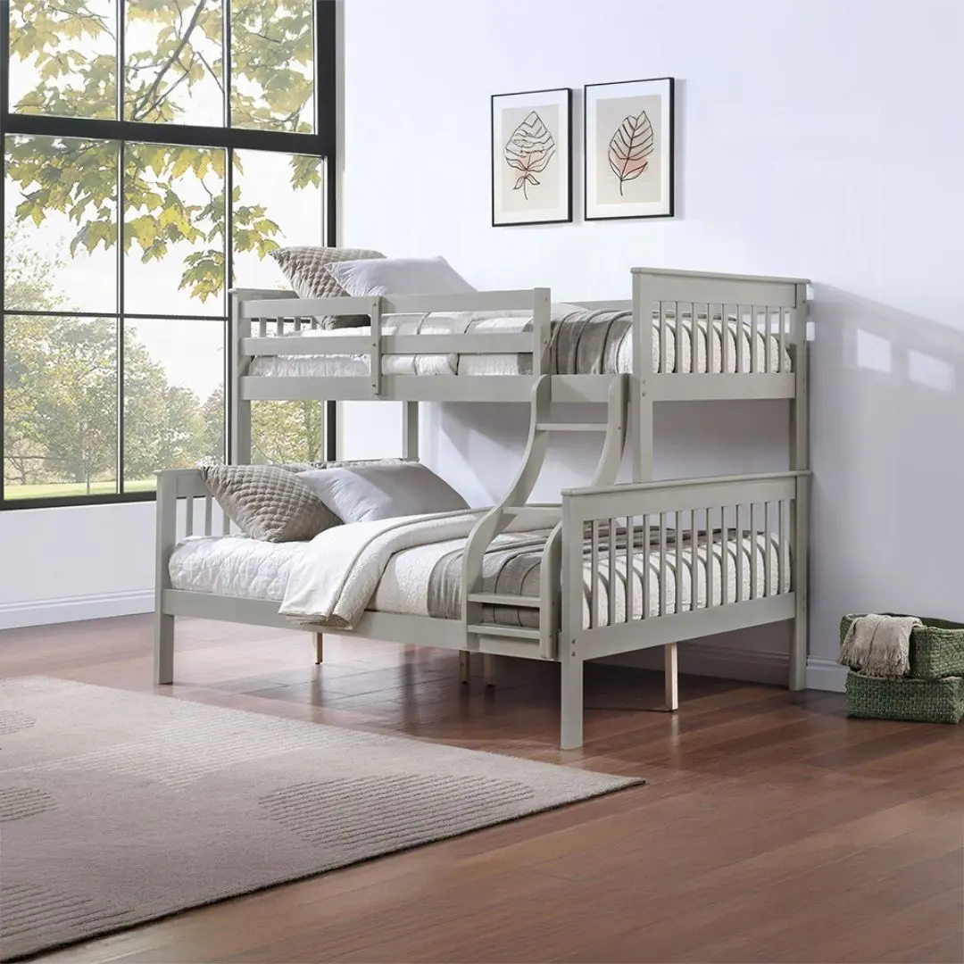 Upgrade your bedroom with the Wooden Twin Over Full Bunk Bed in Gray or Cherry. Order today from Mobilia Cleopatra Furniture, where style, comfort, and durability meet.