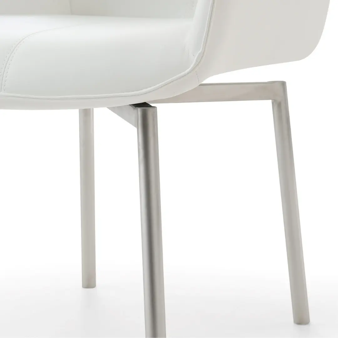 Paired with the table are four 1218 Swivel Dining Chairs upholstered in smooth, White PU (YFL-U05). Each chair features a 360-degree swivel for fluid movement and ergonomic support, making dining not only stylish but supremely comfortable. The elegant stainless-steel legs mirror the refined sophistication of the dining table for a unified, polished look.