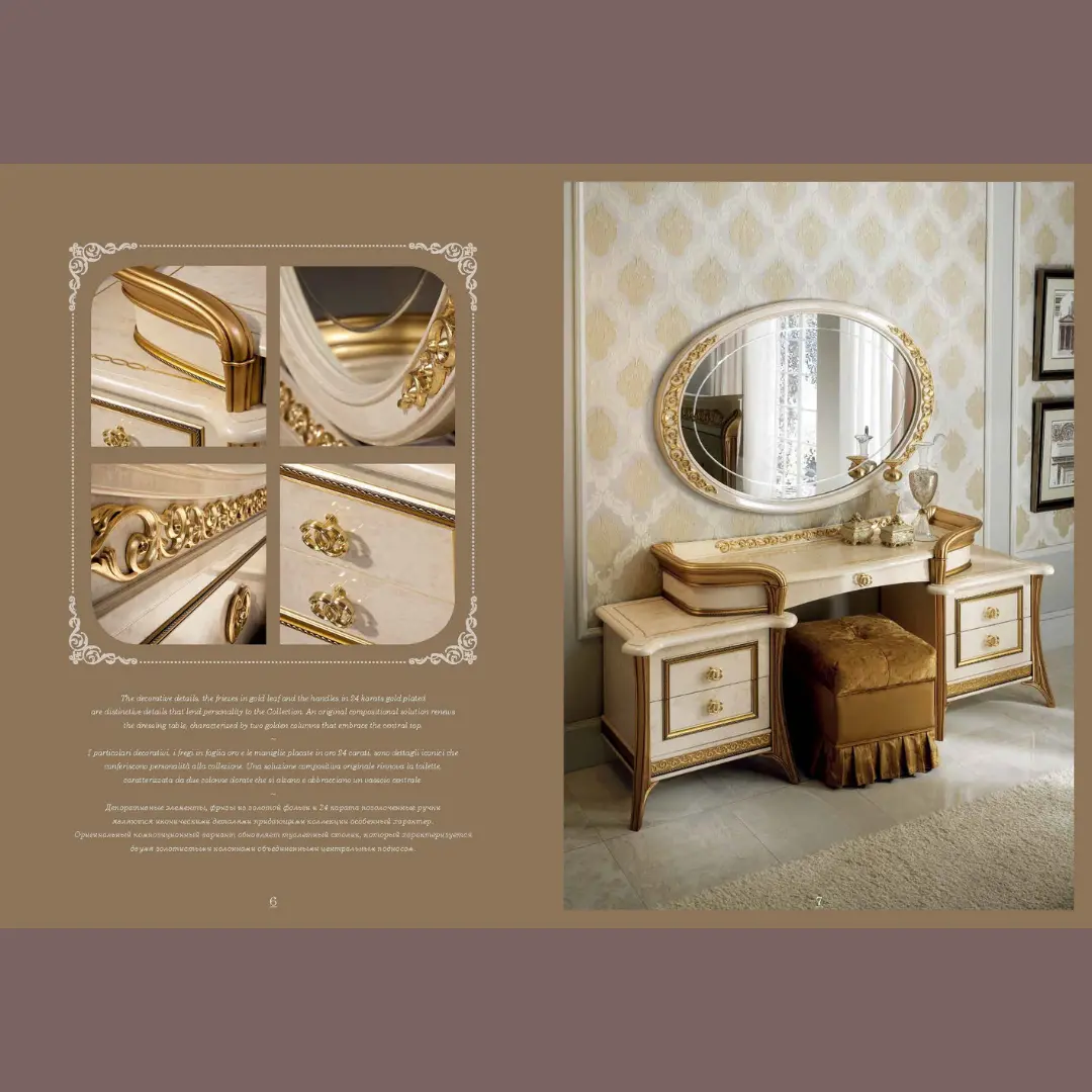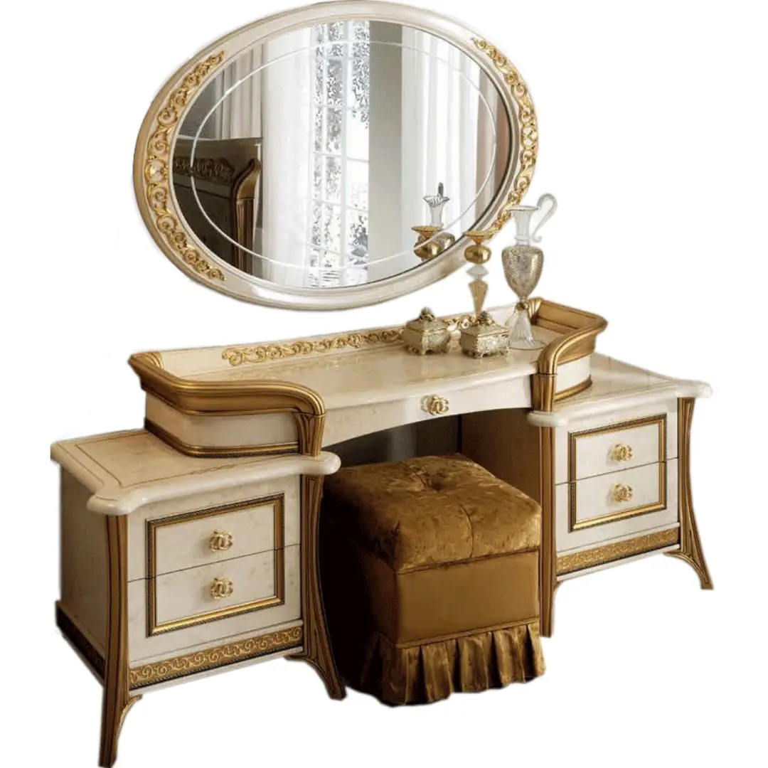 Inspired by the grandeur of traditional Italian interiors, the Shiny Melodia Vanity Dresser showcases ornate detailing, radiant metallic finishes, and graceful symmetry. Its rich textures and golden accents reflect a refined taste, blending seamlessly in luxury bedrooms and upscale interior schemes.