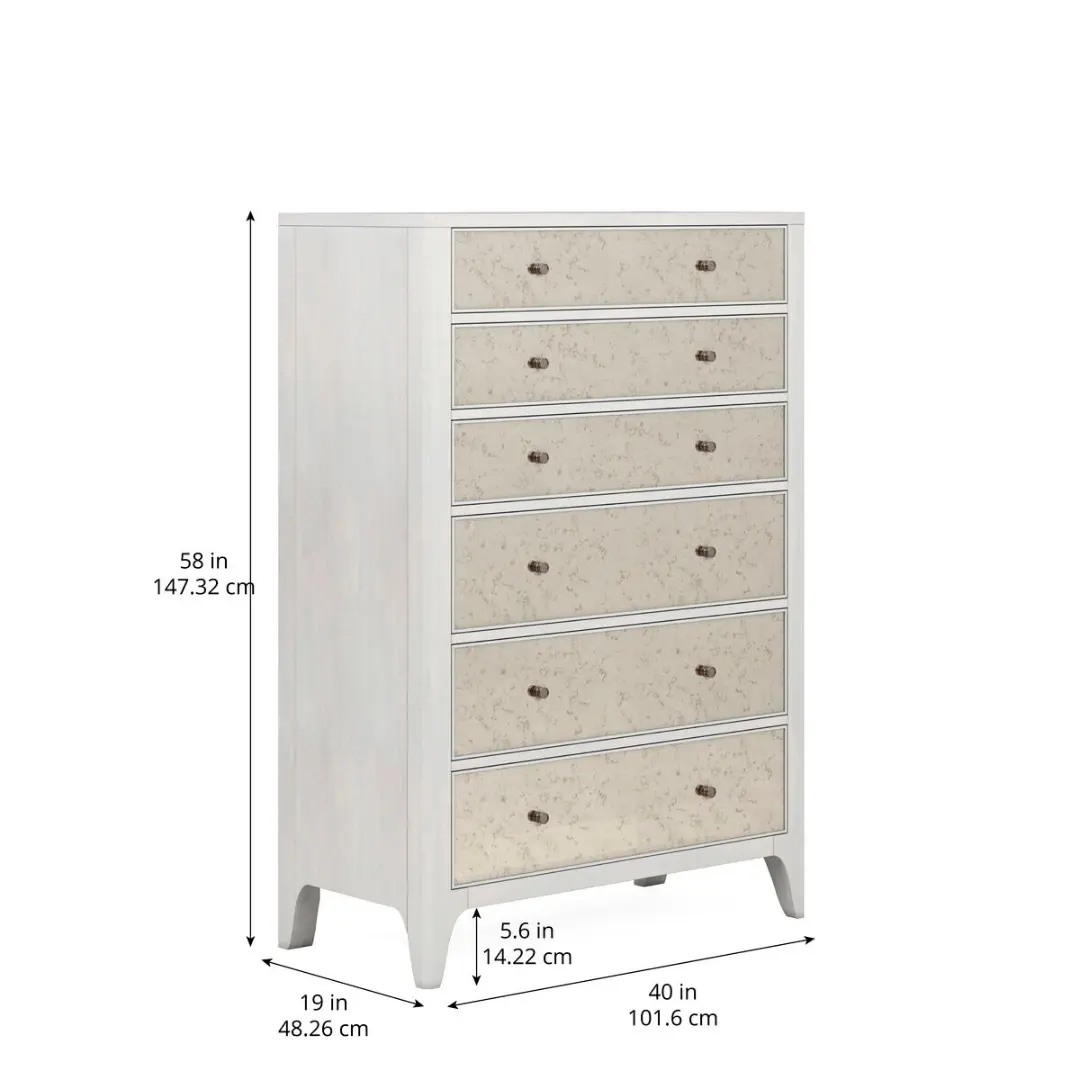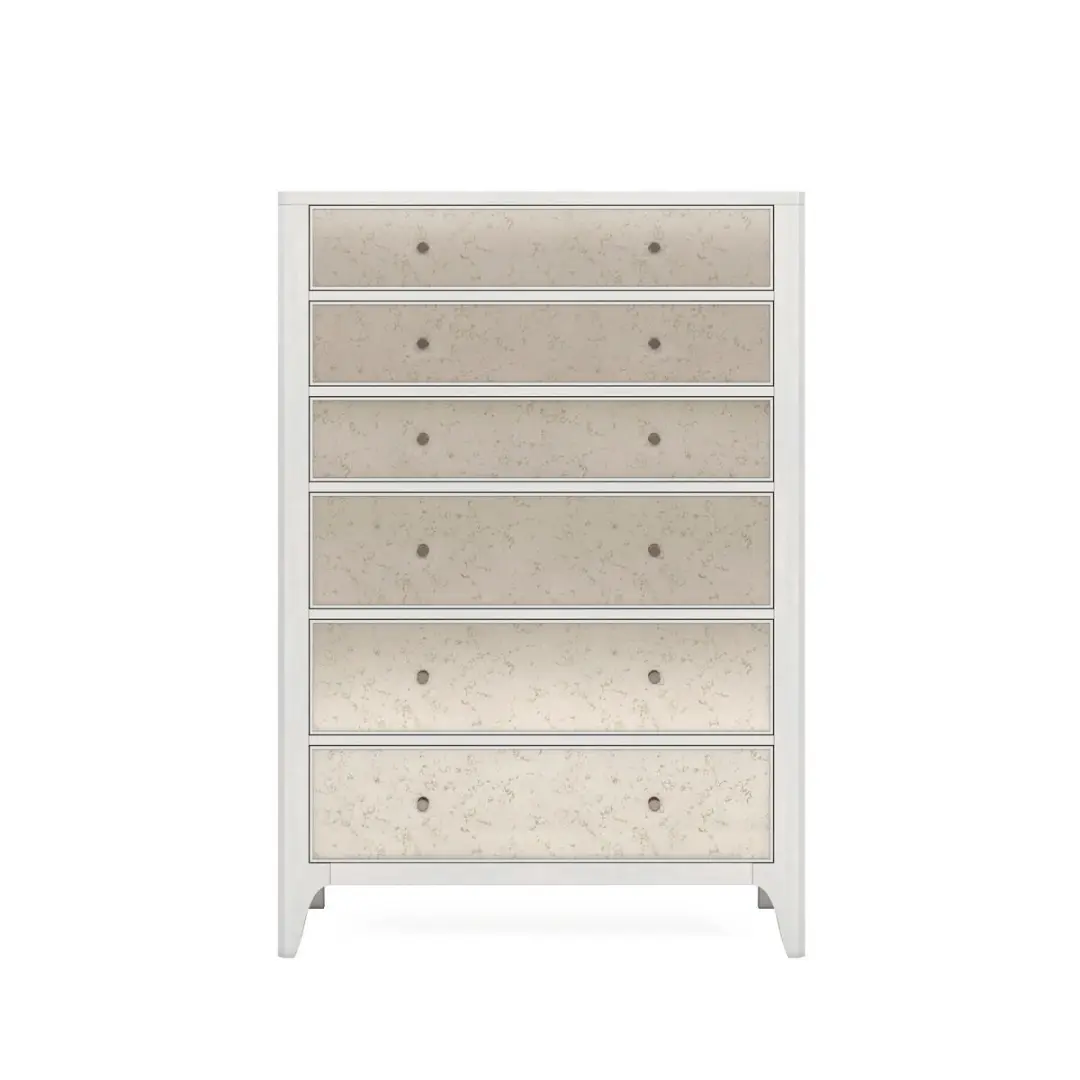 The Mezzanine chest stands out with its graceful dove gray finish and intricate detailing. Maple veneers create a soft, neutral palette that seamlessly integrates into a variety of bedroom décors. Each drawer front features antique mirrored panels, offering a shimmer and vintage feel that quietly elevates the space without overwhelming it.