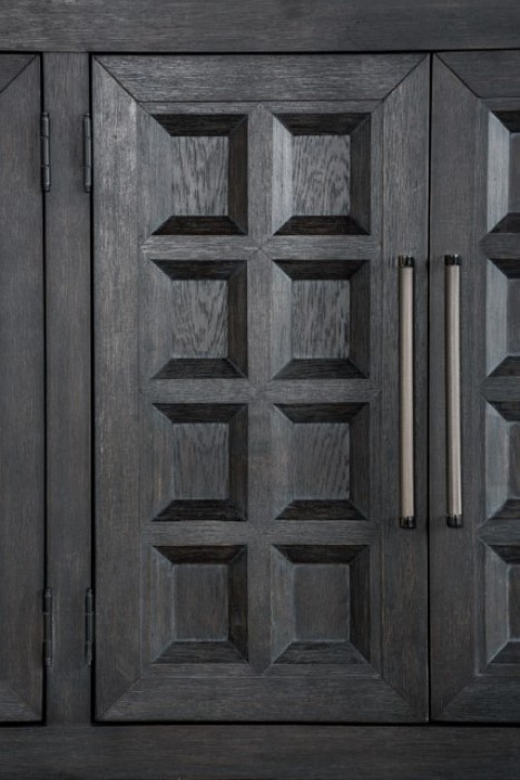 The Hatton Cross 4-Door Cabinet brings bold contemporary design and practical storage to your dining room, living room, or entryway. With its Weathered Black finish and architectural detailing, this cabinet enhances any modern interior with elevated style.