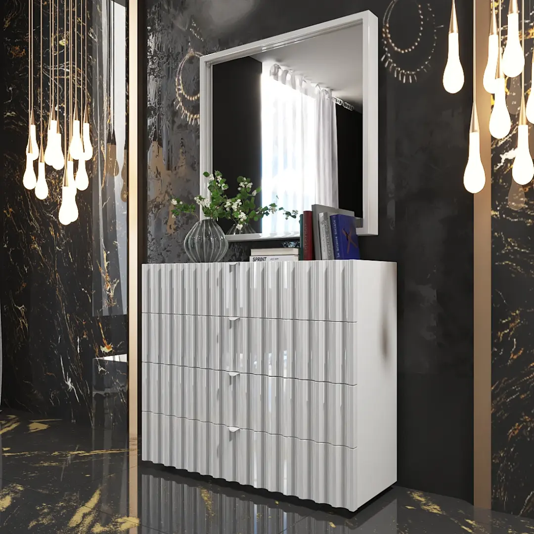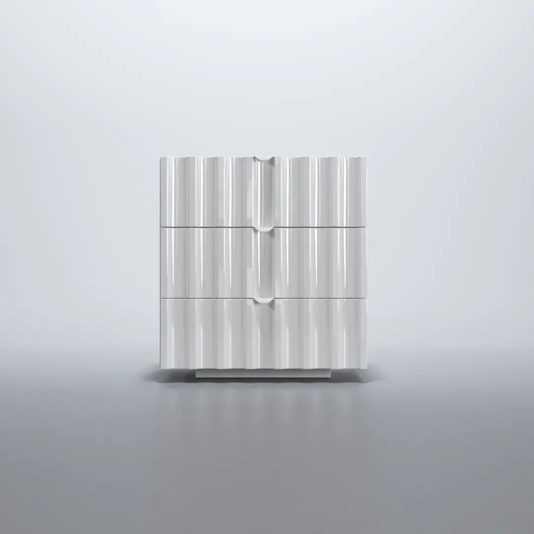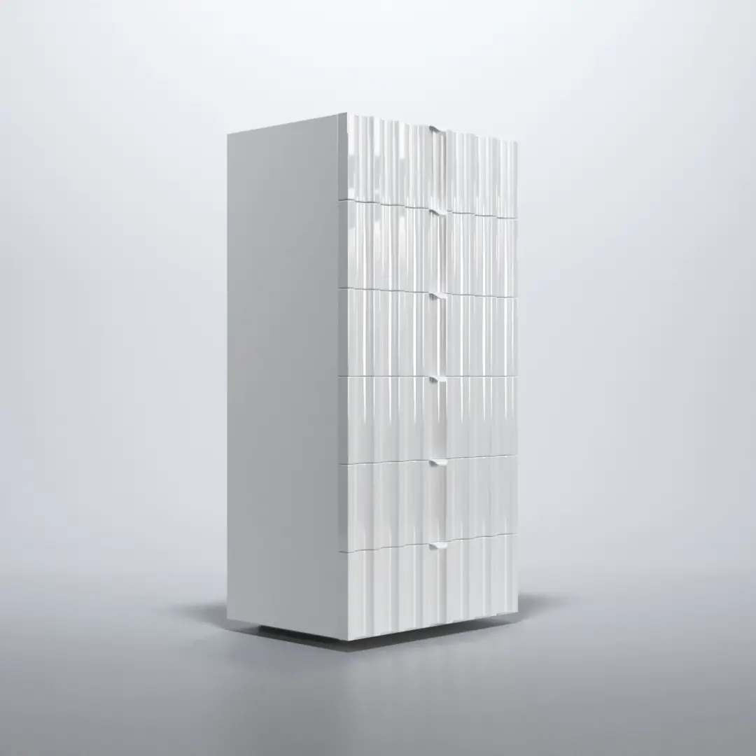 The Shiny Orion collection is defined by its clean lines and luminous textures. Each piece features a high-gloss lacquered finish that captures and reflects ambient light, enhancing the room’s natural brightness. The eco-leather upholstered headboard offers a tactile contrast, featuring a subtle embossed pattern that adds dimension and richness. This exquisite combination of materials exudes understated elegance while making the bed a true centerpiece.