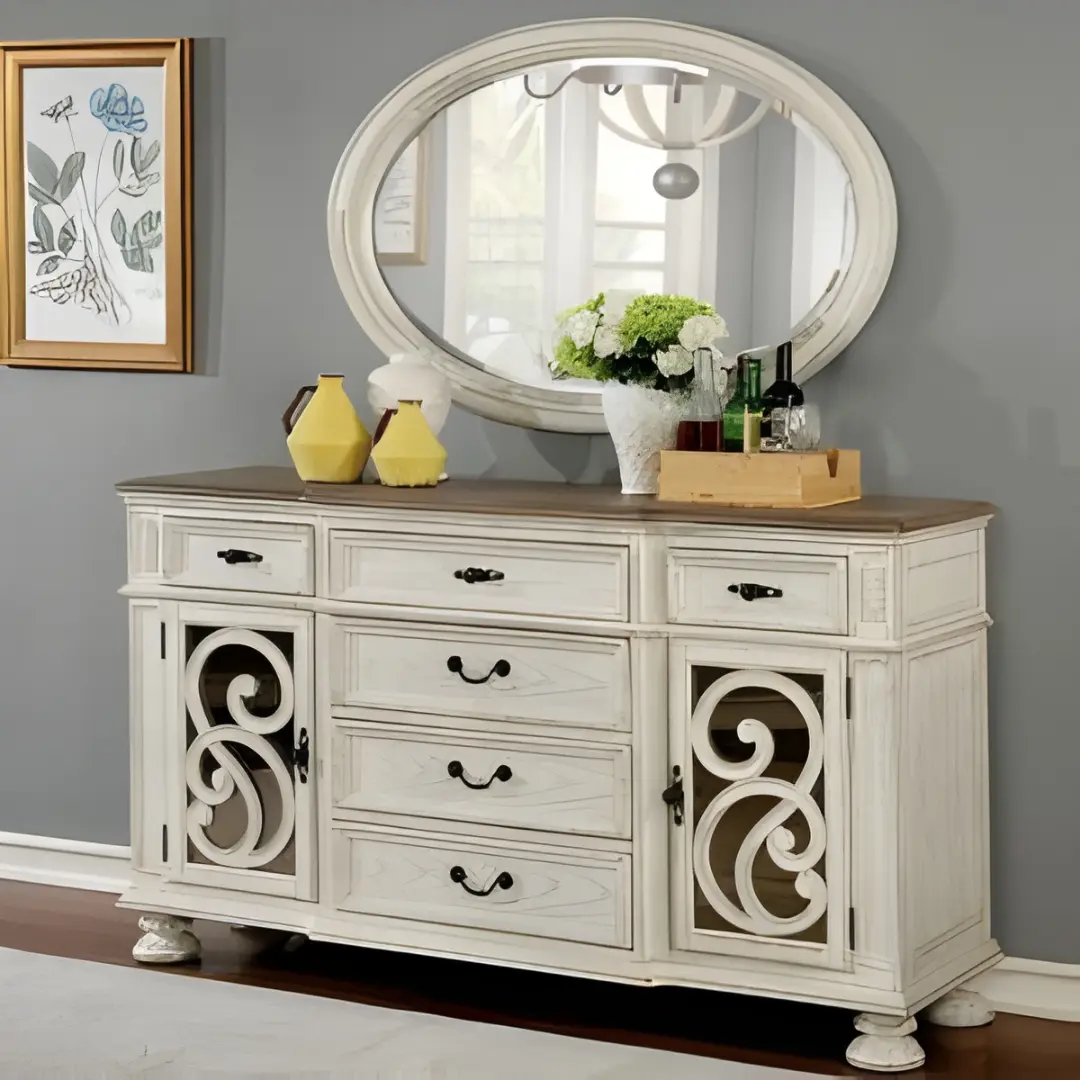 The rustic antique white finish adds a layer of vintage charm while softening the overall aesthetic. Unlike stark whites, this gently weathered tone brings warmth without compromising on sophistication—an ideal companion for farmhouse, cottage, or heritage-style environments.