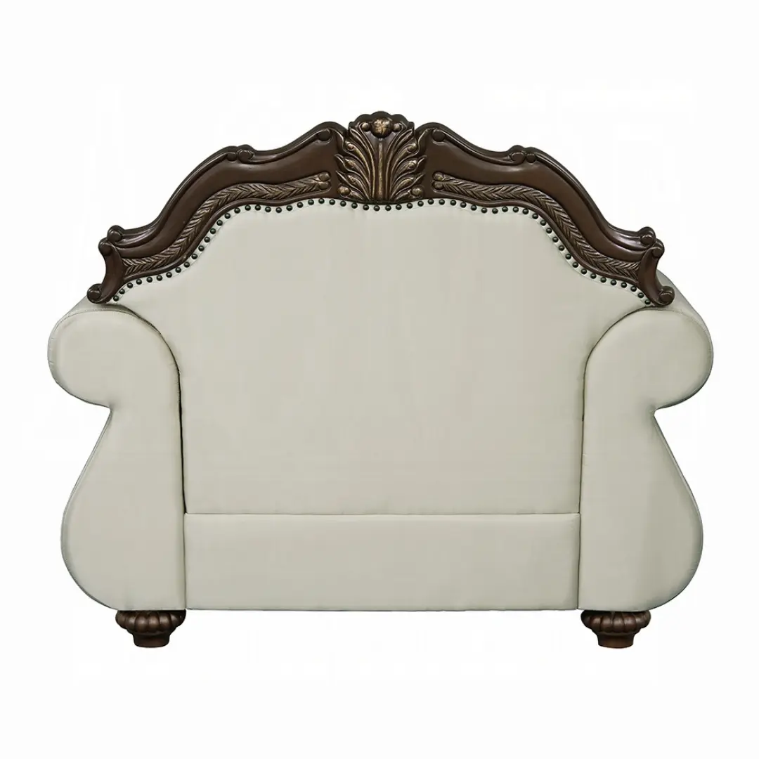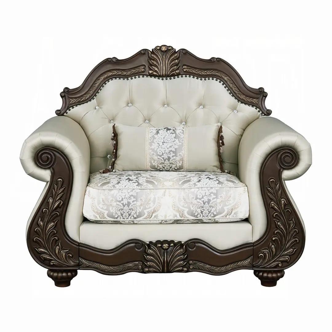 The Pierce Chair brings timeless elegance and luxurious comfort to your living space. Upholstered in soft beige fabric, this chair features a button-tufted tight back and a loose seat cushion with pocket coil construction, providing exceptional support and relaxation. Its wooden inner frame ensures durability, while the intricately carved floral trim on the apron and legs adds a touch of classic sophistication.