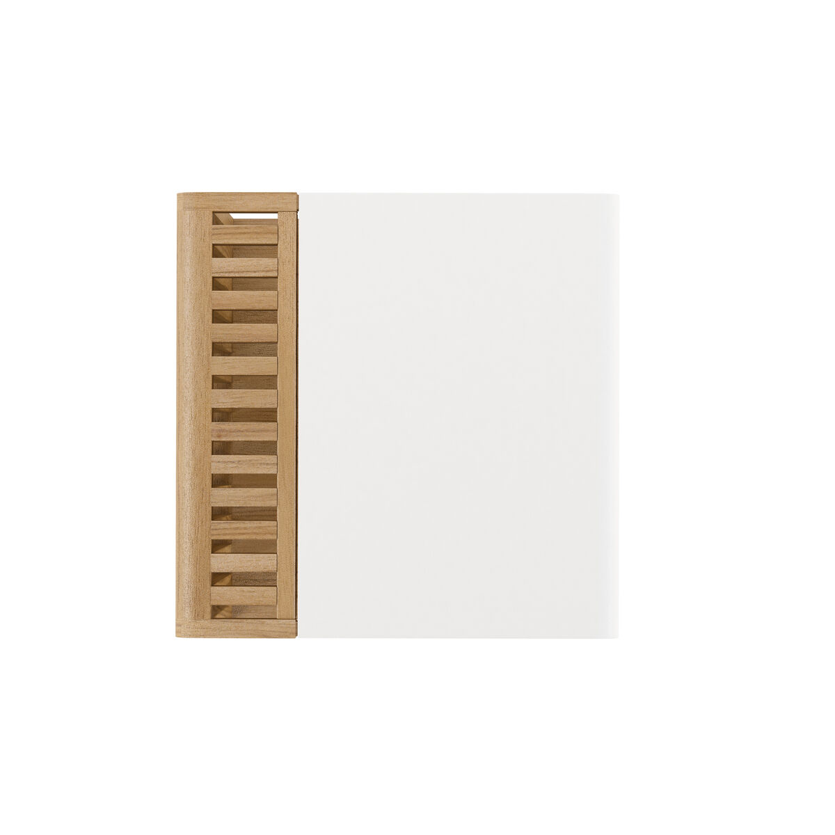 Serene white cast resin meets the warmth and texture of natural wood grain in this modern end table. Featuring a vertical slat design, the wooden half adds a note of texture to this otherwise minimalist design. The open design creates a sense of lightness in this bold piece.