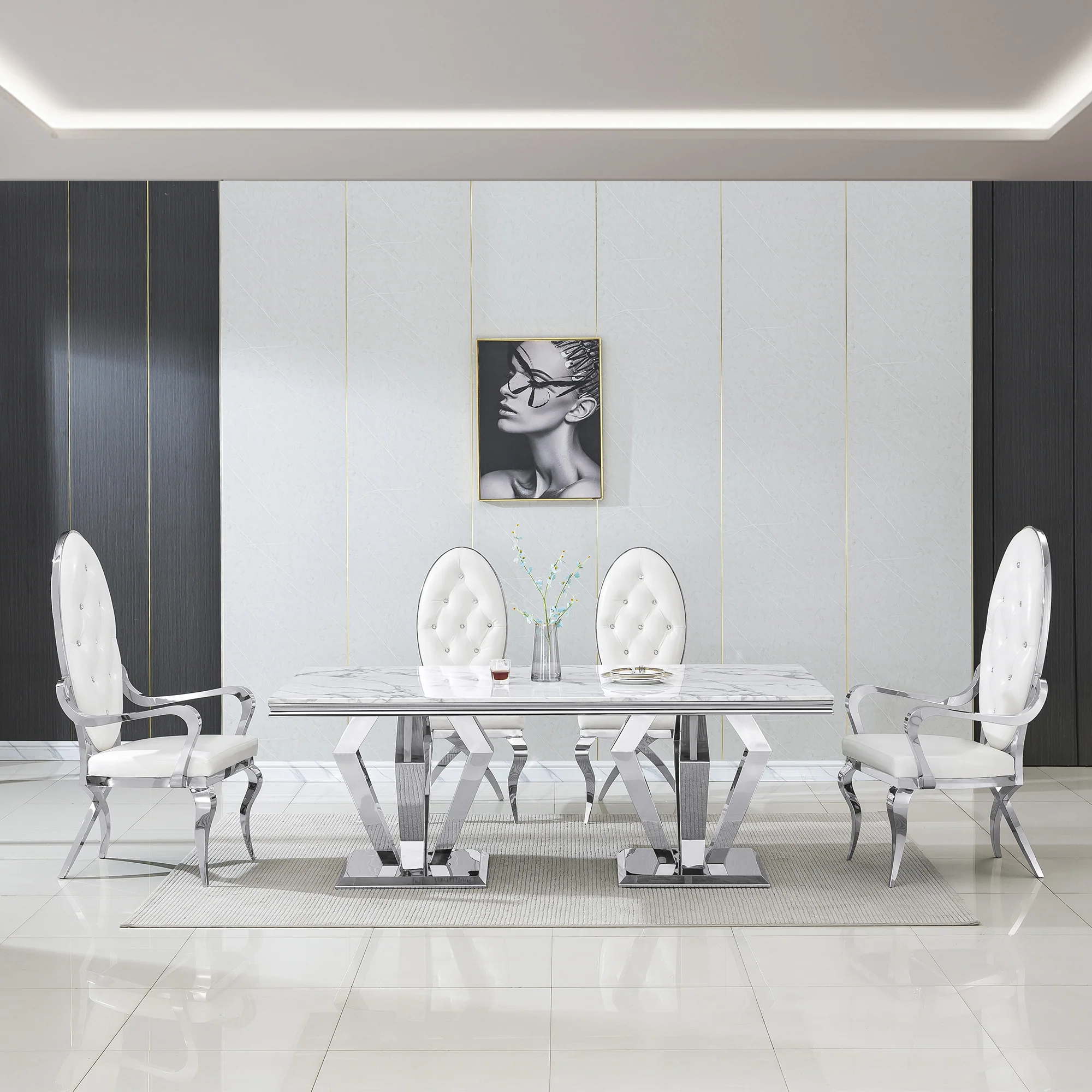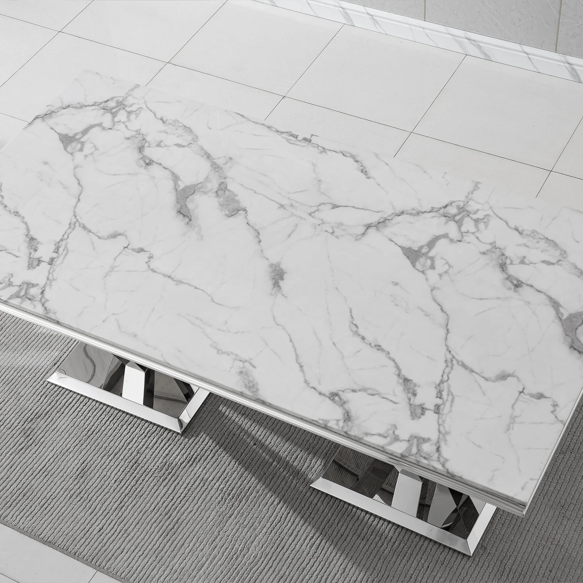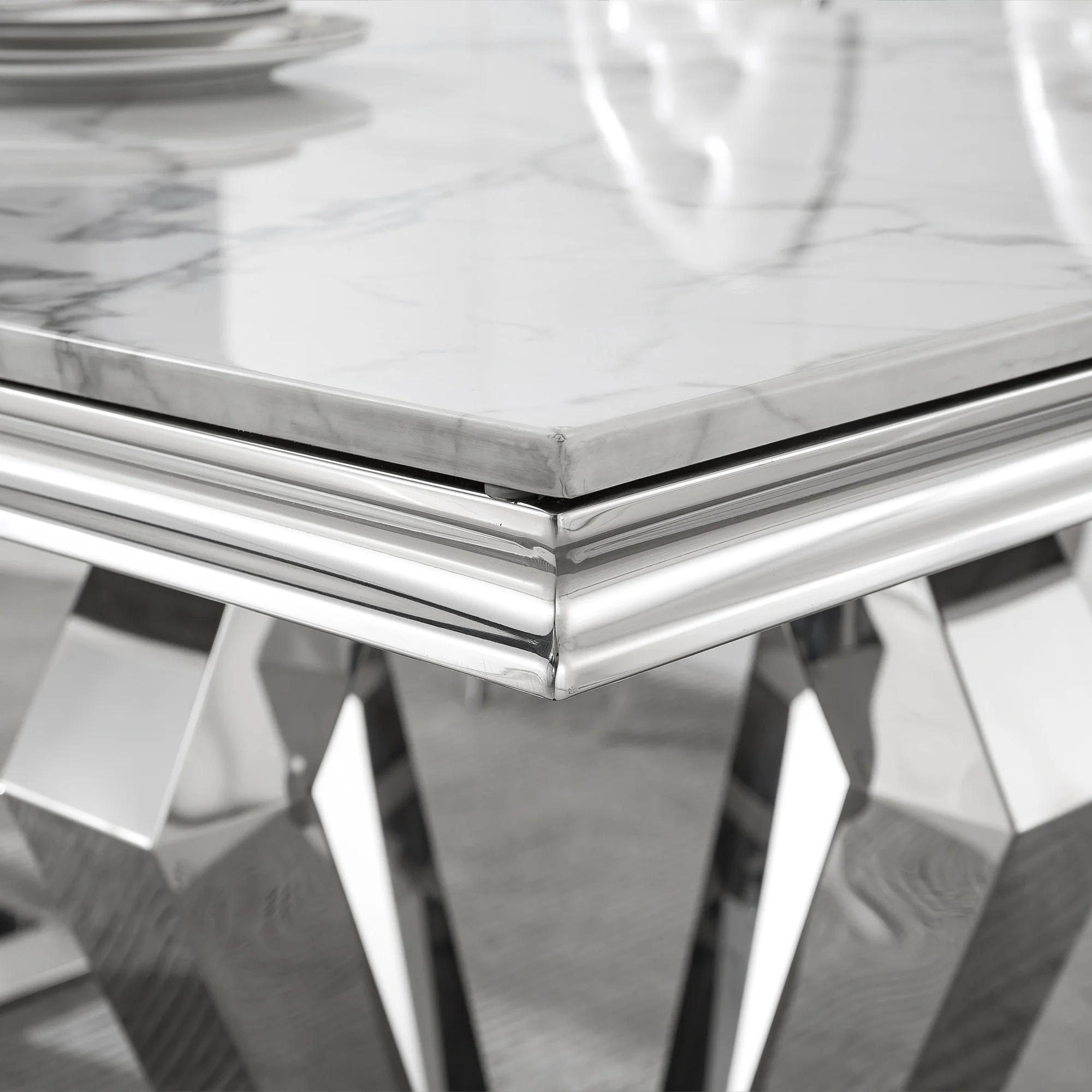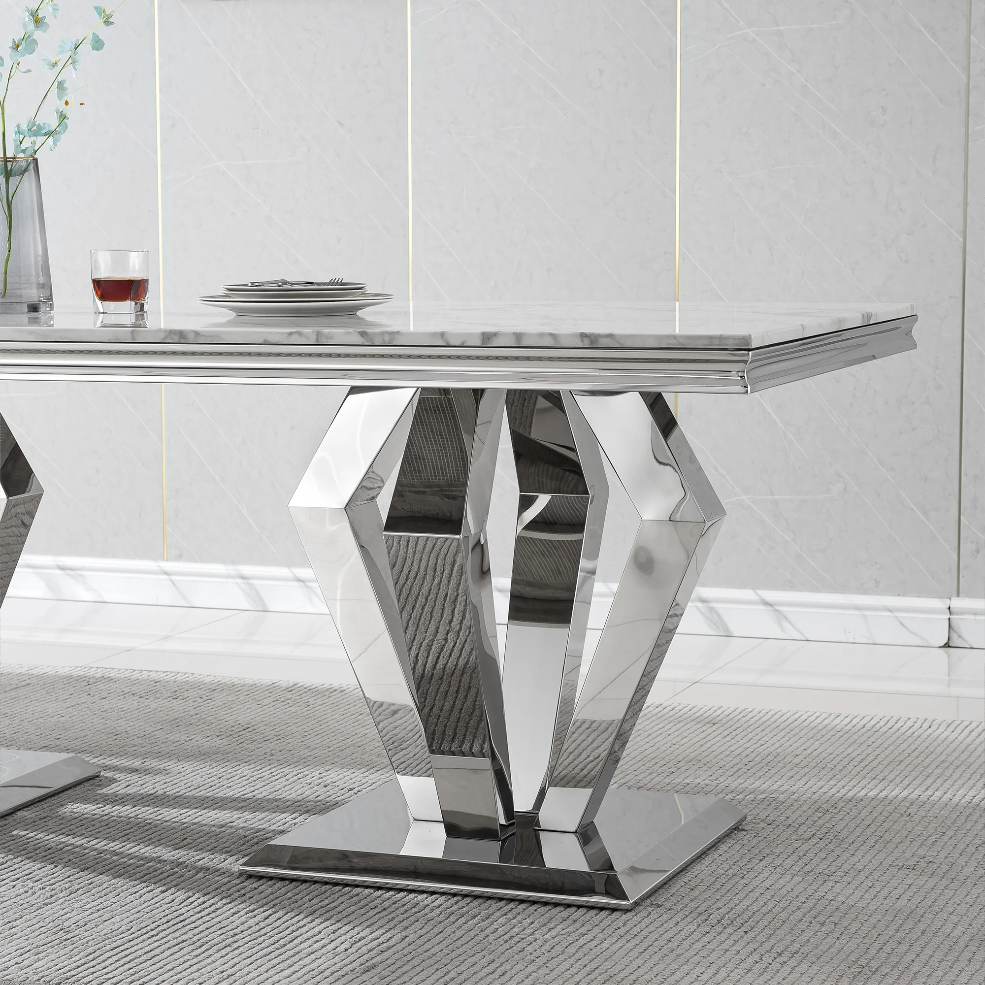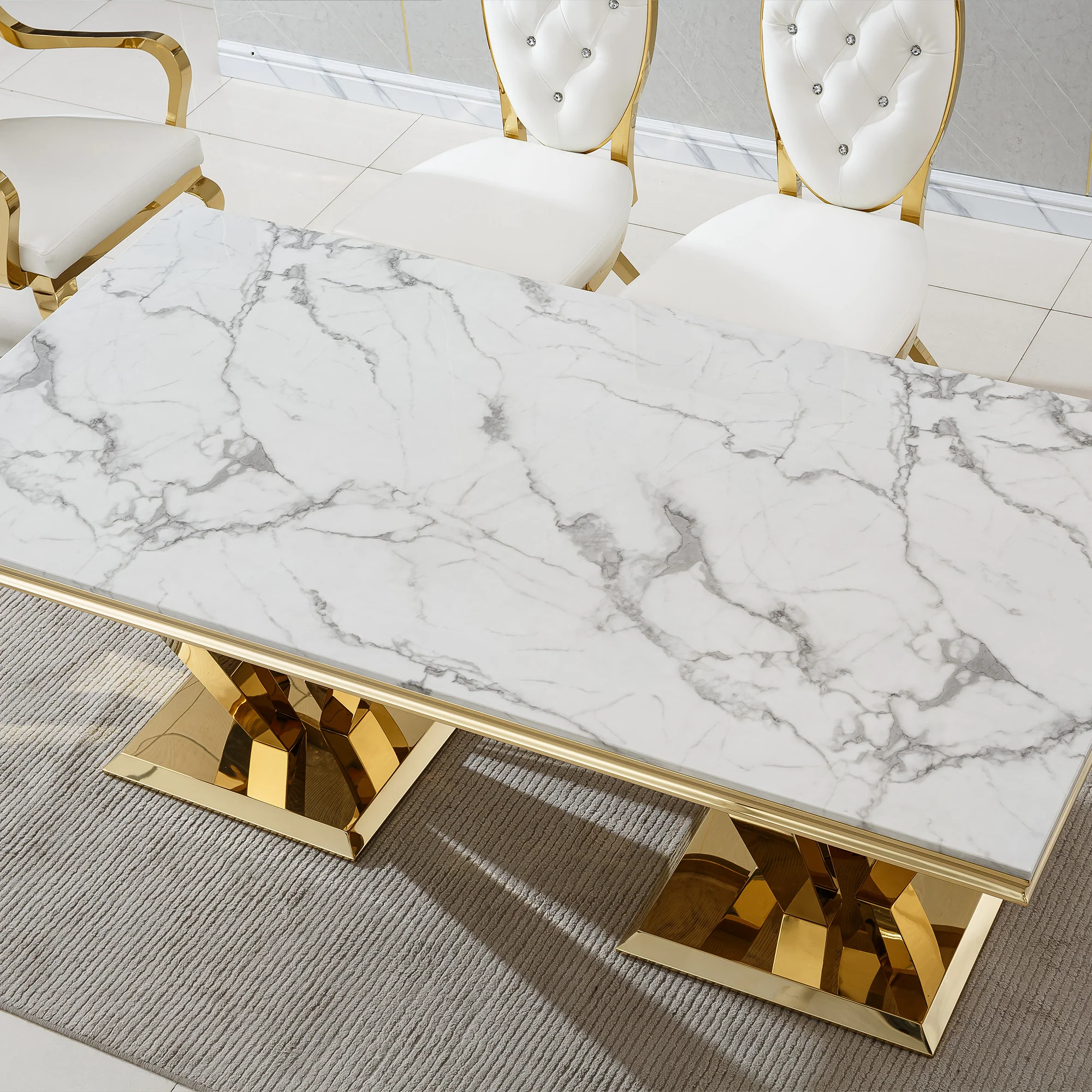 Make a bold statement in your dining space with our white and black marble dining table, a masterpiece that seamlessly blends luxury and durability. Designed for those who appreciate artisan dining tables, this rectangular beauty features a thick 18mm marble top, showcasing a striking contrast of white and black for a timeless, sophisticated look. Supported by a sleek 201 stainless steel base in your choice of gold or silver mirrored finish, this table radiates elegance while providing exceptional stability. Perfect for upscale dining experiences, it transforms any space into a refined and inviting setting.
