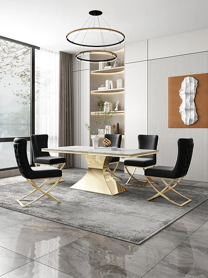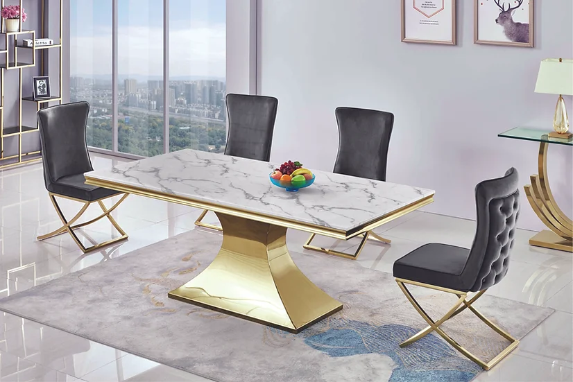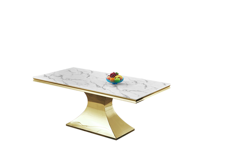 A marble top dining table is more than just a place to gather—it’s a statement of luxury and style. This stunning rectangular dining table features an 18mm thick white marble top, offering both durability and elegance. The sleek stainless steel base, finished in a radiant gold mirrored polish, adds a touch of opulence, creating a striking contrast against the smooth marble surface. Perfect for modern and contemporary spaces, this dining table effortlessly blends sophistication with functionality, making every meal a refined experience.