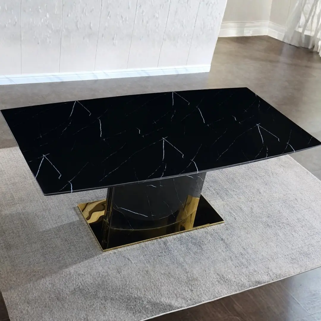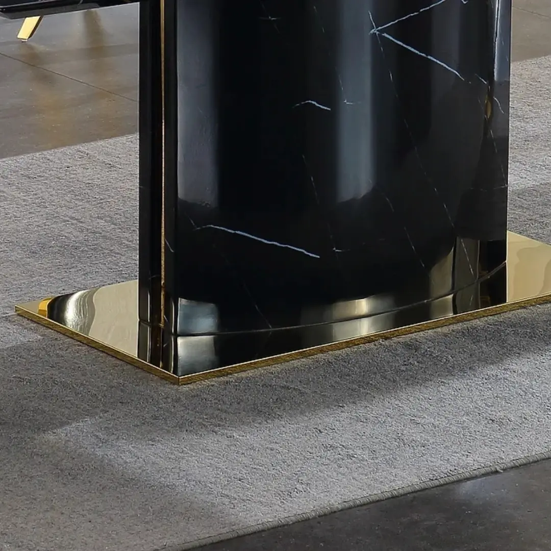 The handcrafted 36mm thick black marble tabletop is a true testament to timeless sophistication. Selected for its natural veining and rich depth of color, each slab offers a unique character that ensures your table is truly one of a kind. Supported by a sculptural stainless steel frame finished in radiant gold mirror polish, the table blends enduring materials with a bold modern aesthetic.