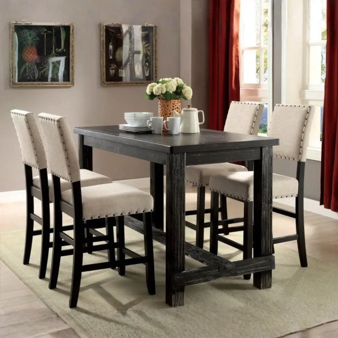 Enhance your dining room with the Sania Counter Ht. Bench CM3324BK-PBN by Furniture of America, a piece that masterfully blends farmhouse flair with enduring craftsmanship. Crafted for those who appreciate the fusion of style and structure, this counter-height bench features a distressed black wood frame paired with a soft beige linen-like upholstered seat—creating both visual contrast and timeless charm.