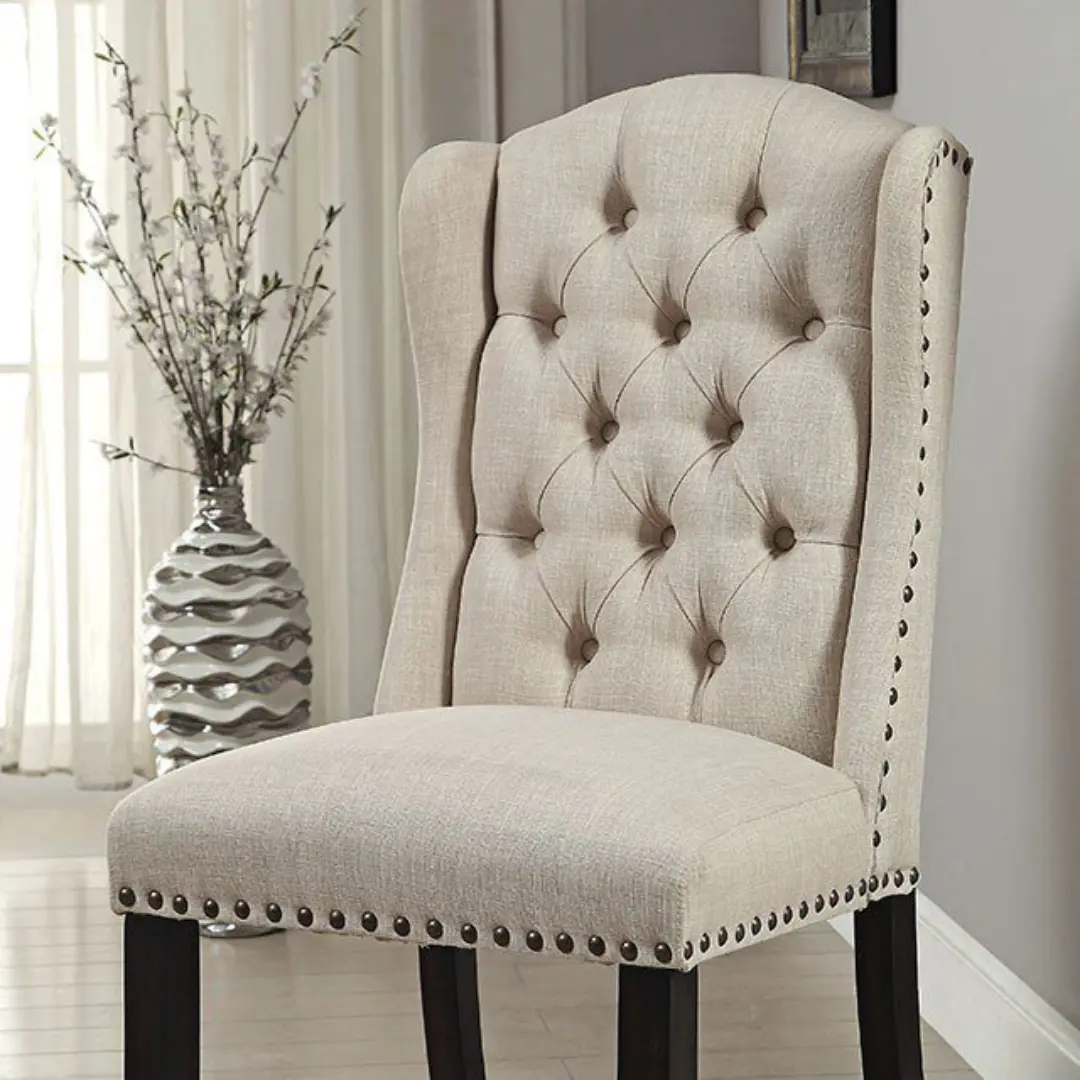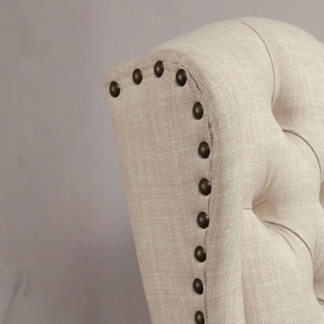 Each side chair is wrapped in a soft, linen-like fabric that evokes comfort and luxury. The tall wingback side design combined with classic button tufting enhances visual appeal while adding structural support. Nailhead trim outlines the elegant silhouette, offering a distinguished, designer touch that elevates these chairs from simple seating to statement furniture.