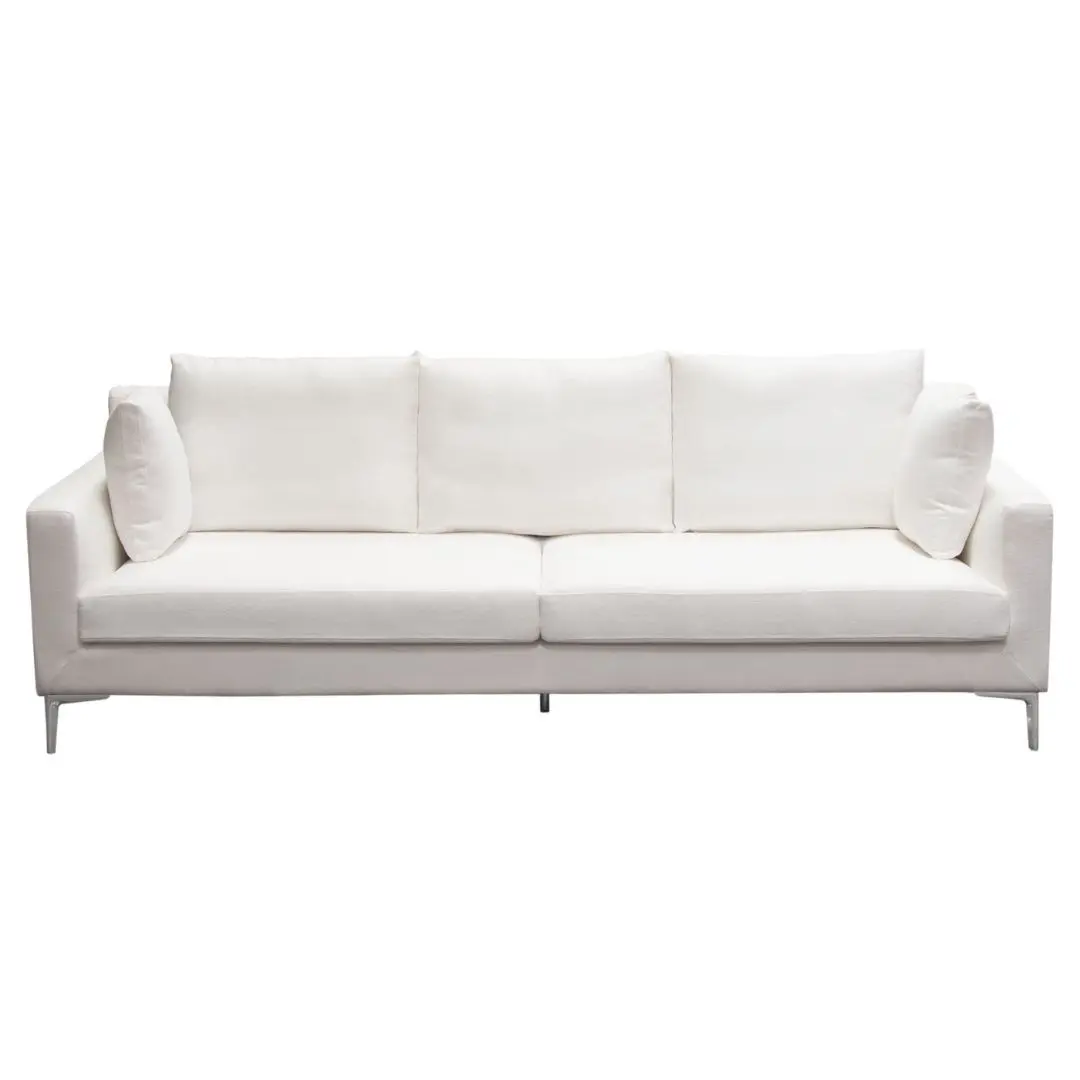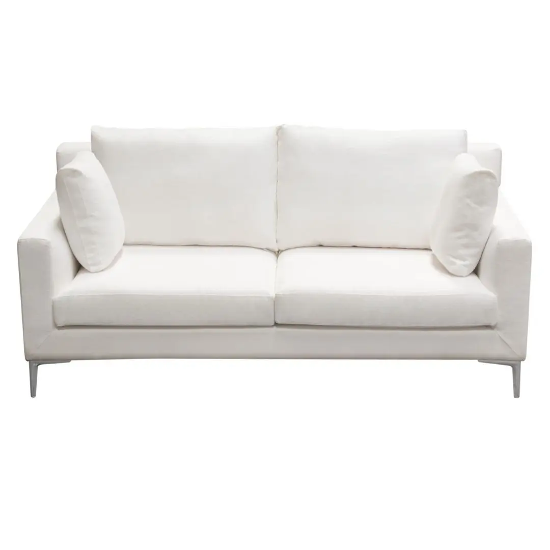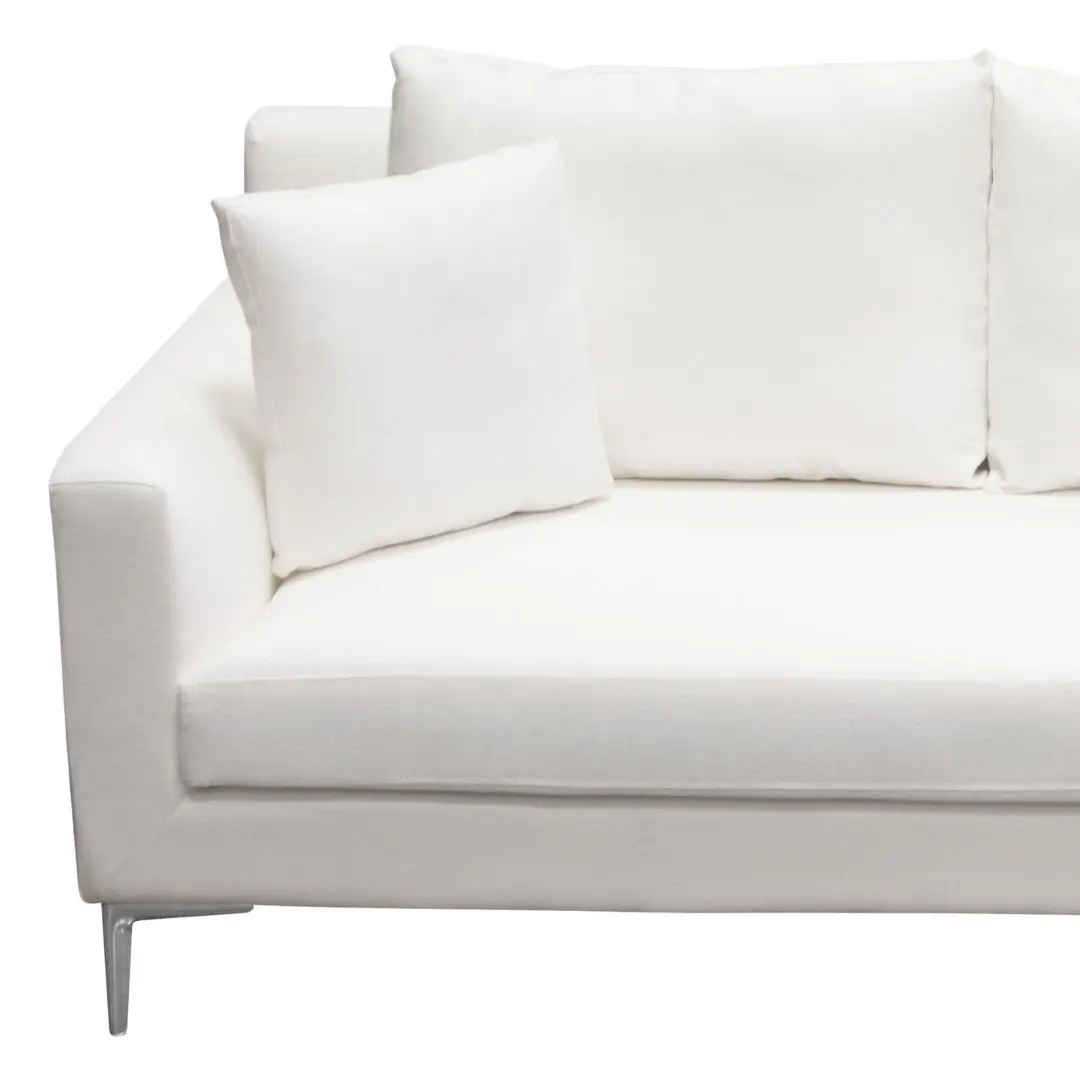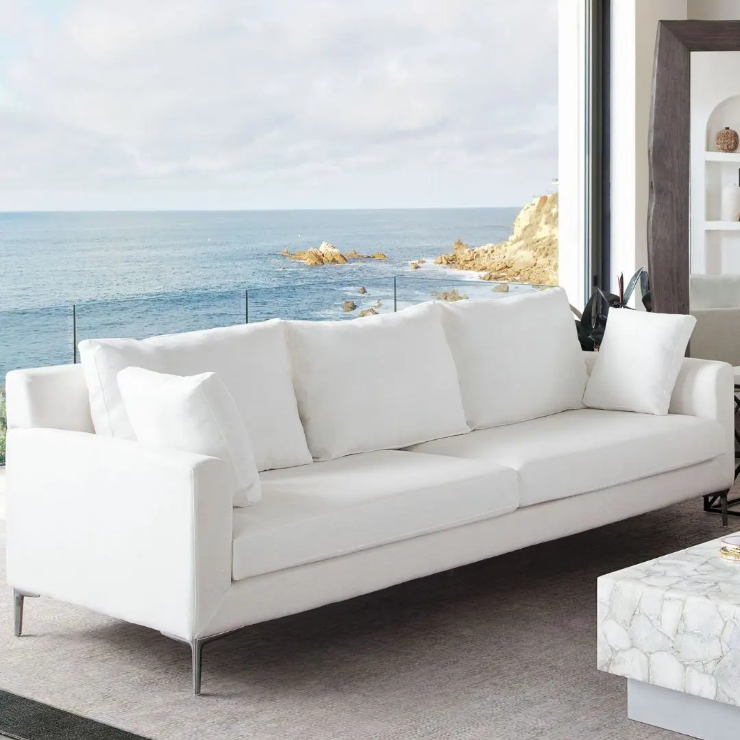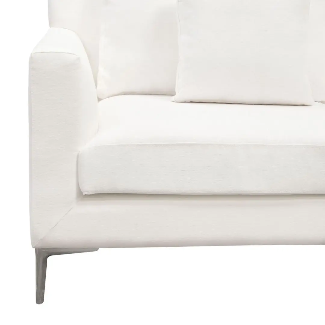 Elevate your living space with the Seattle Loose Back Sofa, a sophisticated white upholstered sofa designed to blend modern elegance with ultimate comfort. Its clean lines, polished silver metal legs, and plush loose back cushions create a timeless look that complements any contemporary or minimalist interior.